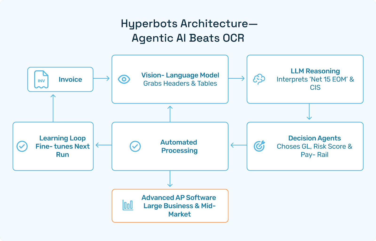Legacy OCR and bot-based AP software can’t deliver 90%+ autonomy. Hyperbots’ Accounts Payable approval software fuses VLM, LLM, and decision agents into one platform, earning top scores in every Accounts Payable automation software comparison.