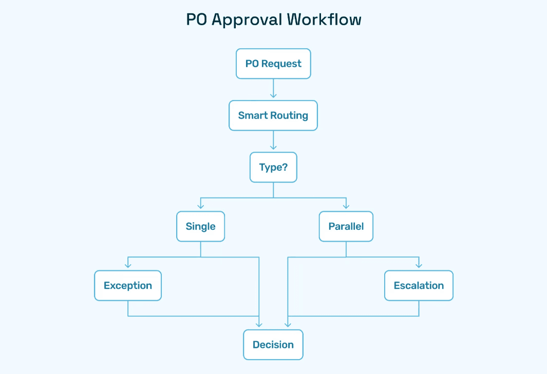 Spend Thresholds → Low-value POs (e.g., <$1,000) auto-approved; higher-value escalated.