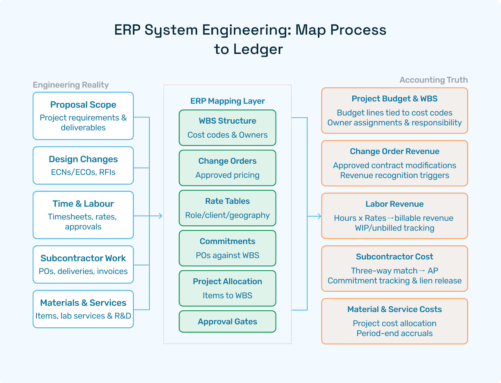 “ERP system engineering” is the discipline of mapping engineering reality to accounting truth. A few patterns to get right:
