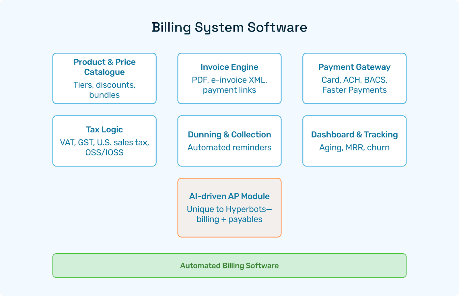 Billing System Software answers that challenge by turning every invoice into structured data, automating reminders, and posting payments to the ledger in real time. But not all billing packages are equal: some stop at invoice PDFs, and others, like Hyperbots’ Invoice Processing Co-Pilot, pair Automated Billing Software with AI-driven Accounts Payable to unify cash in and cash out.