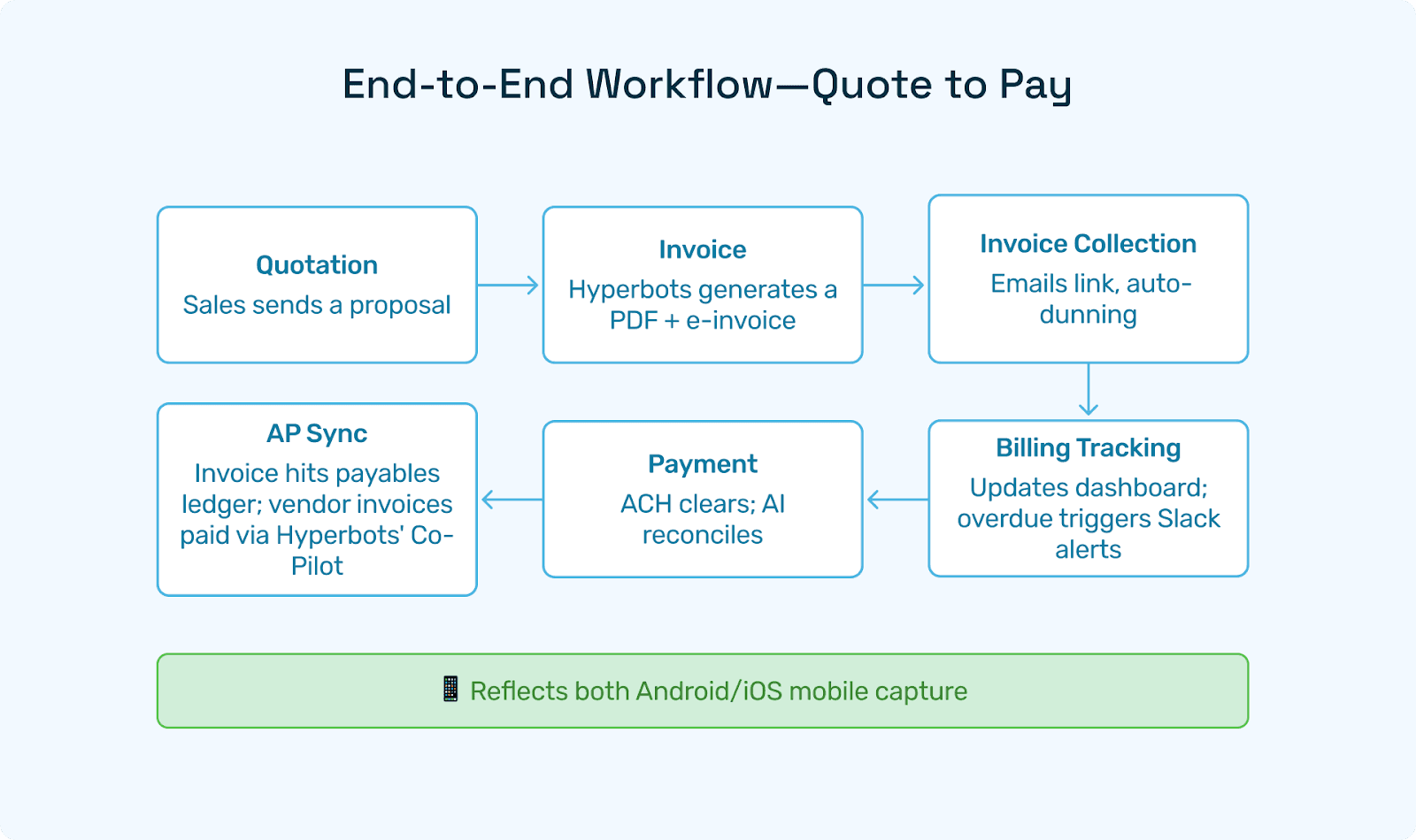 Step 6 – AP Sync: Invoice hits payables ledger; vendor invoices paid via Hyperbots’ Co-Pilot.