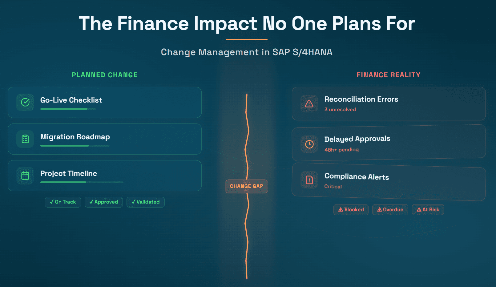 This cross-functional change impact is the dimension of process change that is most consistently missed in finance-focused change management planning. SAP S/4HANA transformations often touch multiple end-to-end processes and teams, also impacting edge systems and tools. The wider organization must be brought along and engaged in the change journey. Finance change management planning that focuses only on the finance module misses the processes upstream and downstream that determine what arrives in the finance team's inbox every day.