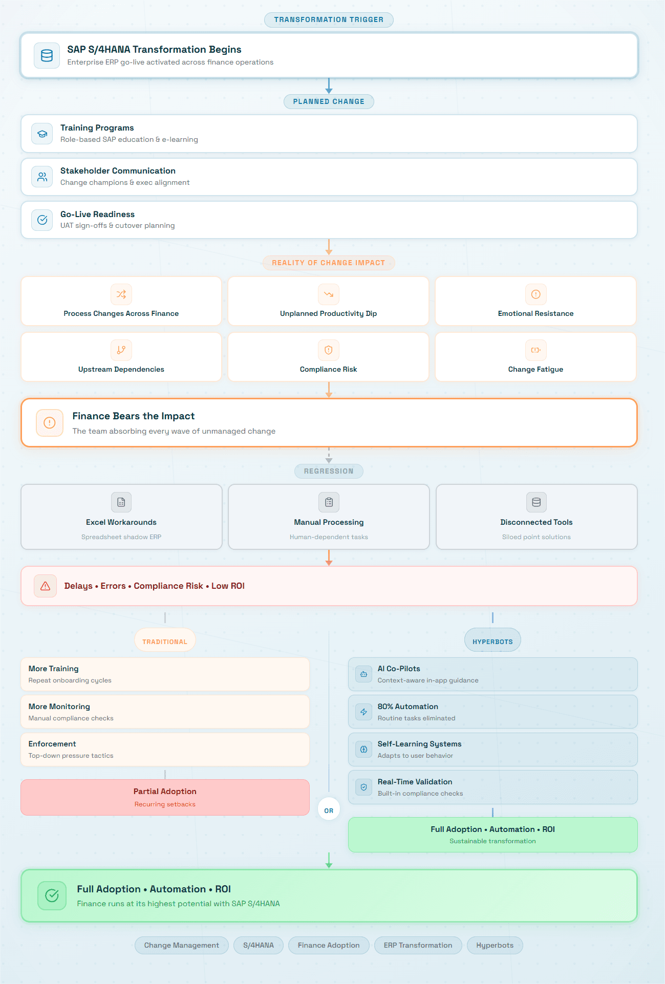 Hyperbots AI Co-pilots make the new SAP-based finance processes demonstrably better than any process the finance team was running before, eliminating the root causes of resistance, regression, and shadow system persistence simultaneously. The change impact of moving to Hyperbots-powered SAP is categorically different from the change impact of moving to unconfigured SAP, because the finance team does not have more work to do in a new system, they have less work to do, with better outcomes.