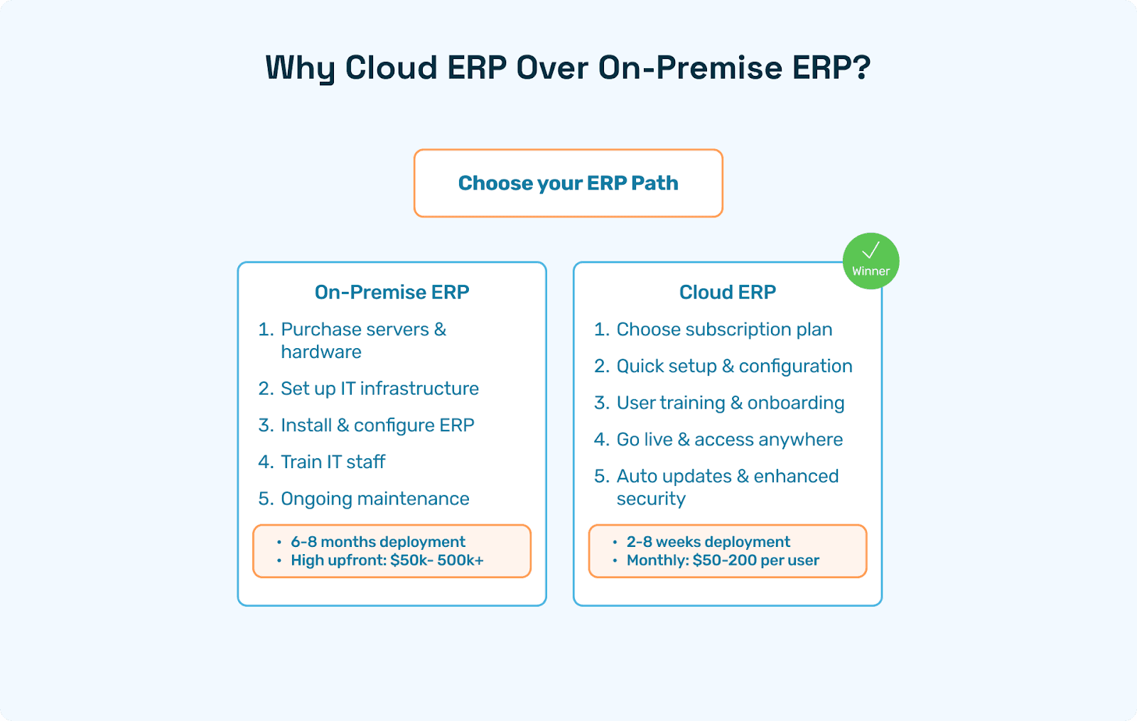 In the debate of ERP on premise vs cloud, cloud ERP wins for many modern businesses due to: