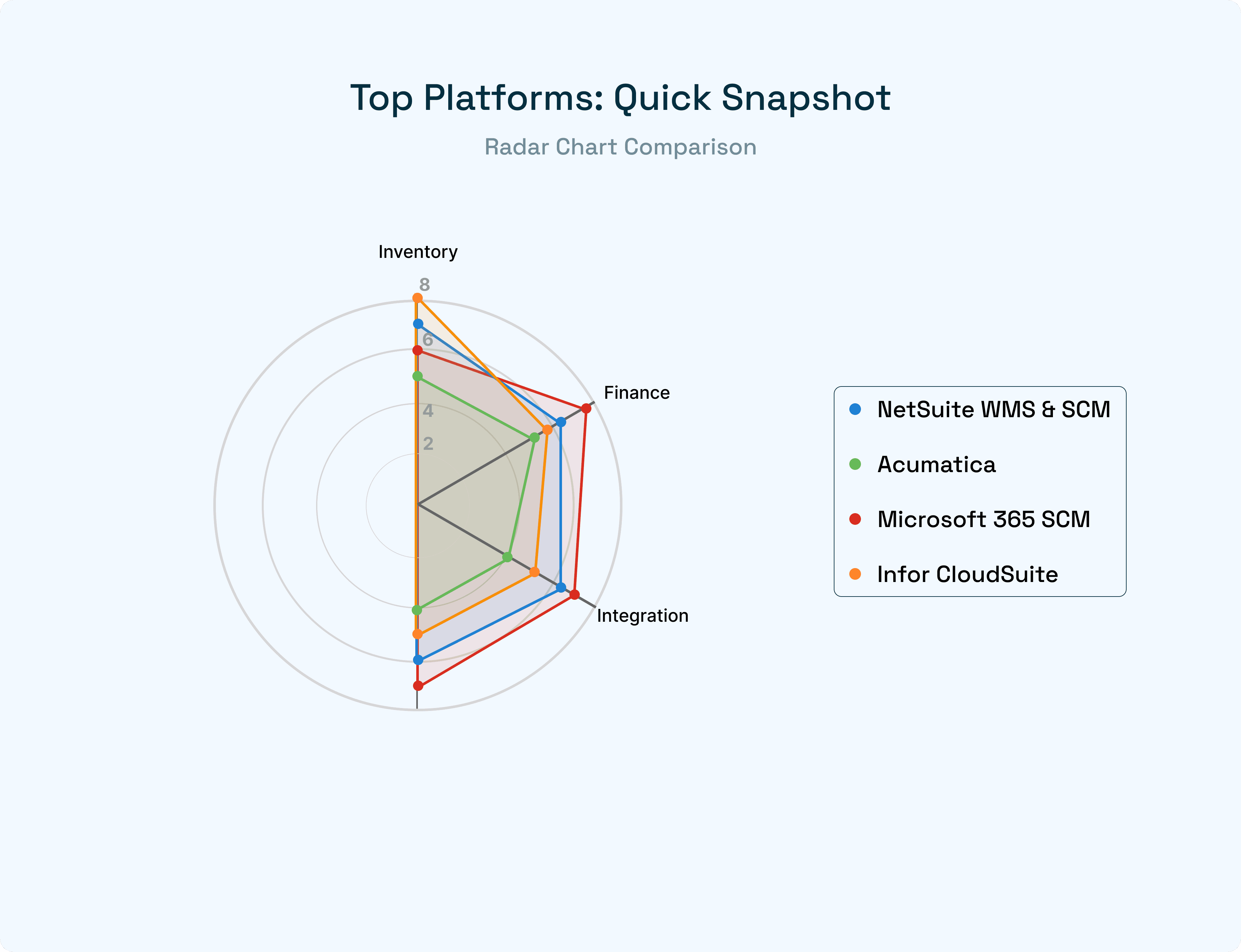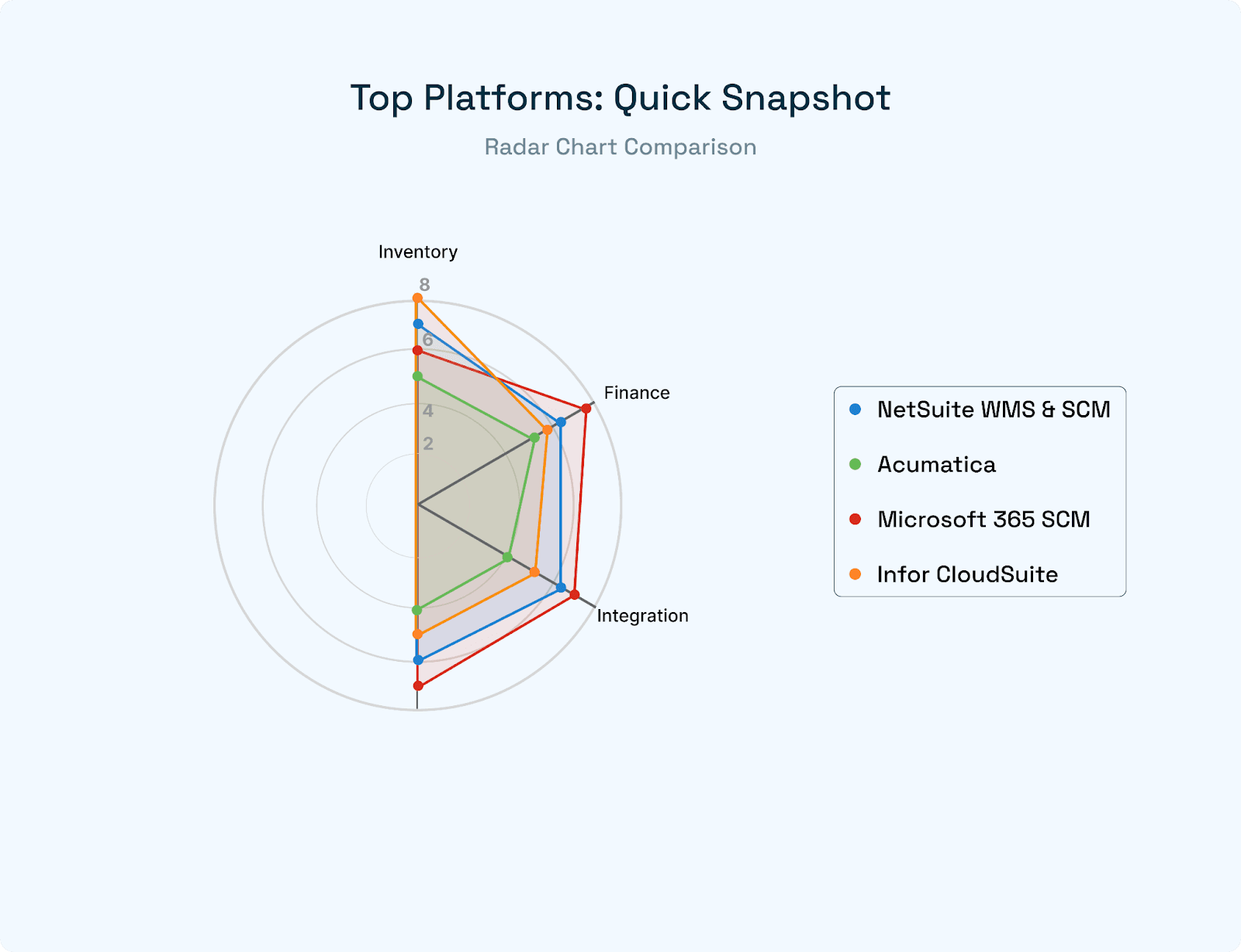 NetSuite WMS & SCM | Mid-market | Unified finance + distribution | Setup effort |