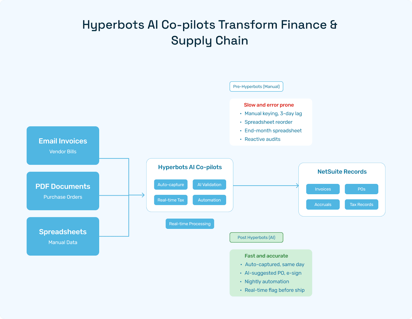 NetSuite’s cloud-based distribution software offers bin-level tracking, wave picking, and real-time gross margin. Yet AP, accruals, and vendor onboarding remain labor-intensive. Enter Hyperbots: