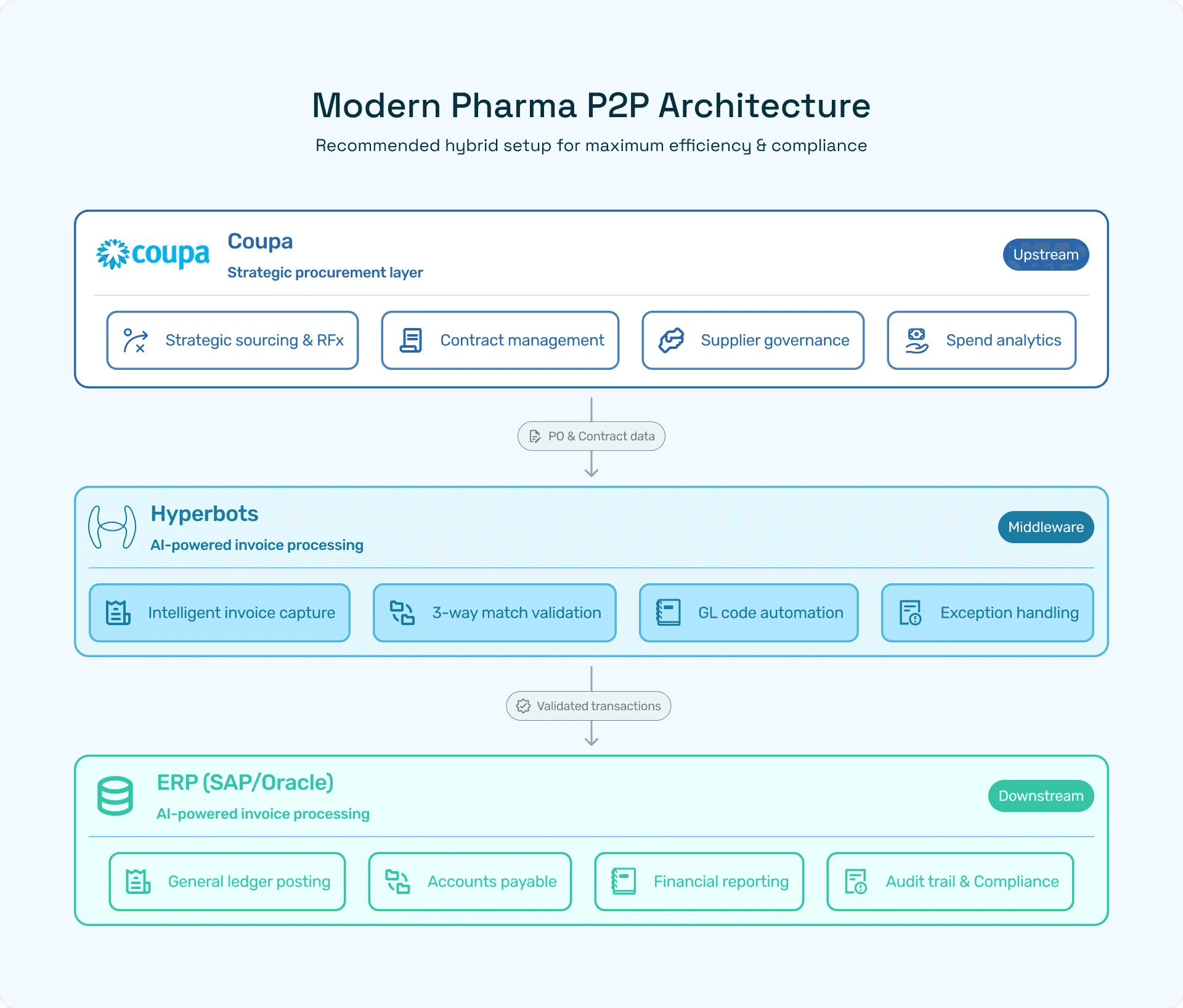 Yes. Many regulated organizations use Coupa for sourcing, contracts, and supplier governance while deploying Hyperbots for invoice accuracy, accrual posting, and GL validation. This hybrid model balances procurement control with finance-grade compliance and faster closes.