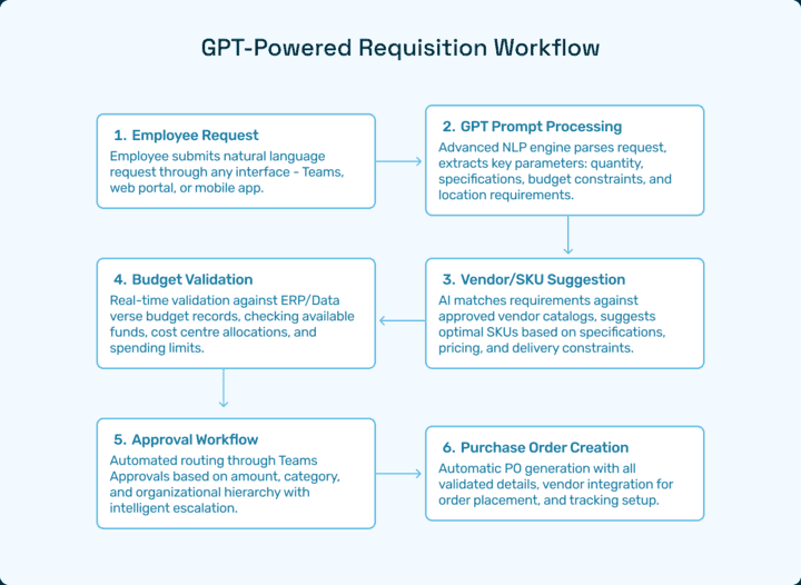 GPT workflows connect directly with ERP and finance systems to cross-check each requisition against the relevant departmental budget before the approval chain begins. The data flow works roughly as follows: