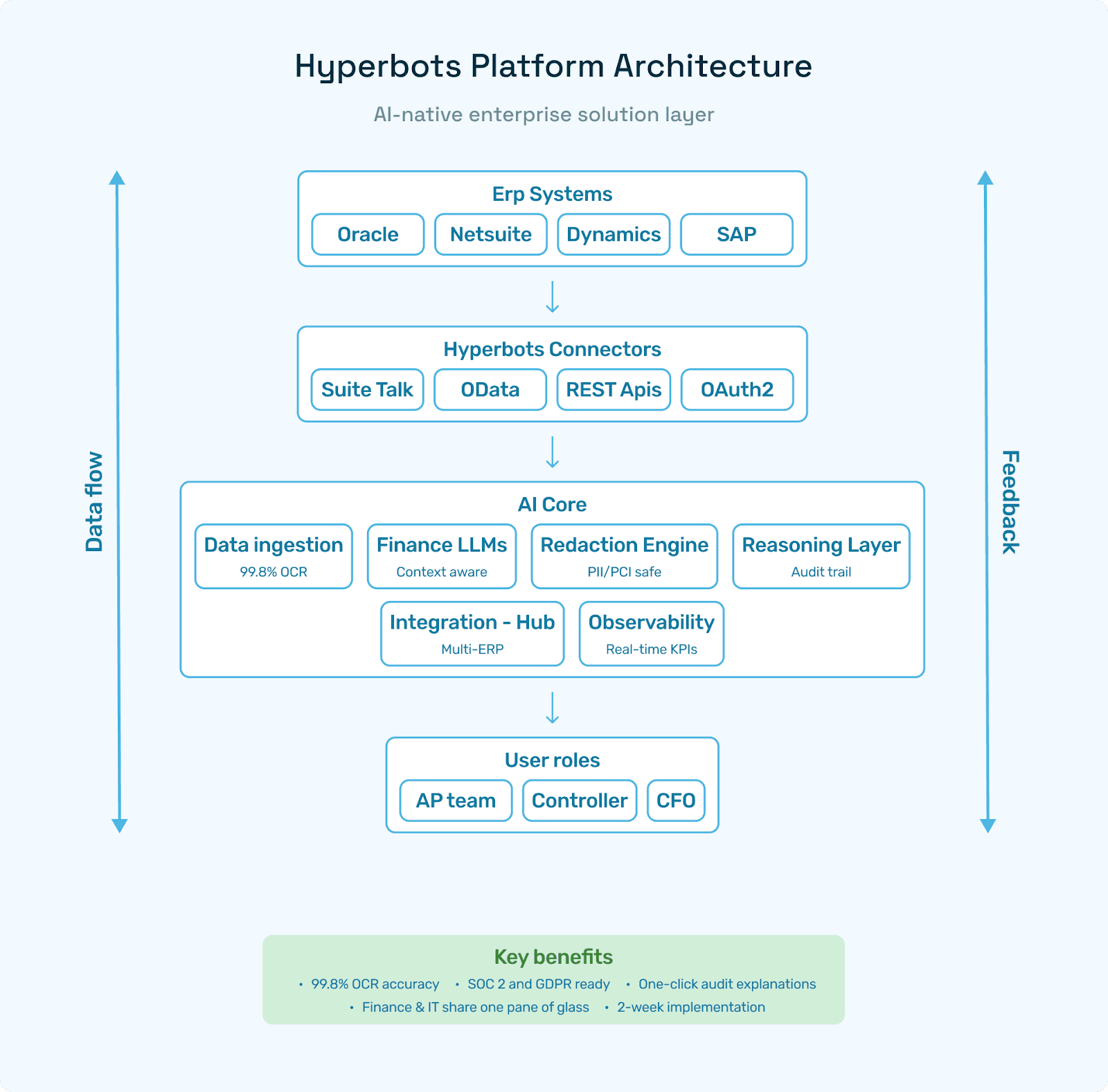 Hyperbots plugs into any major ERP via APIs, delivering domain-trained AI agents: