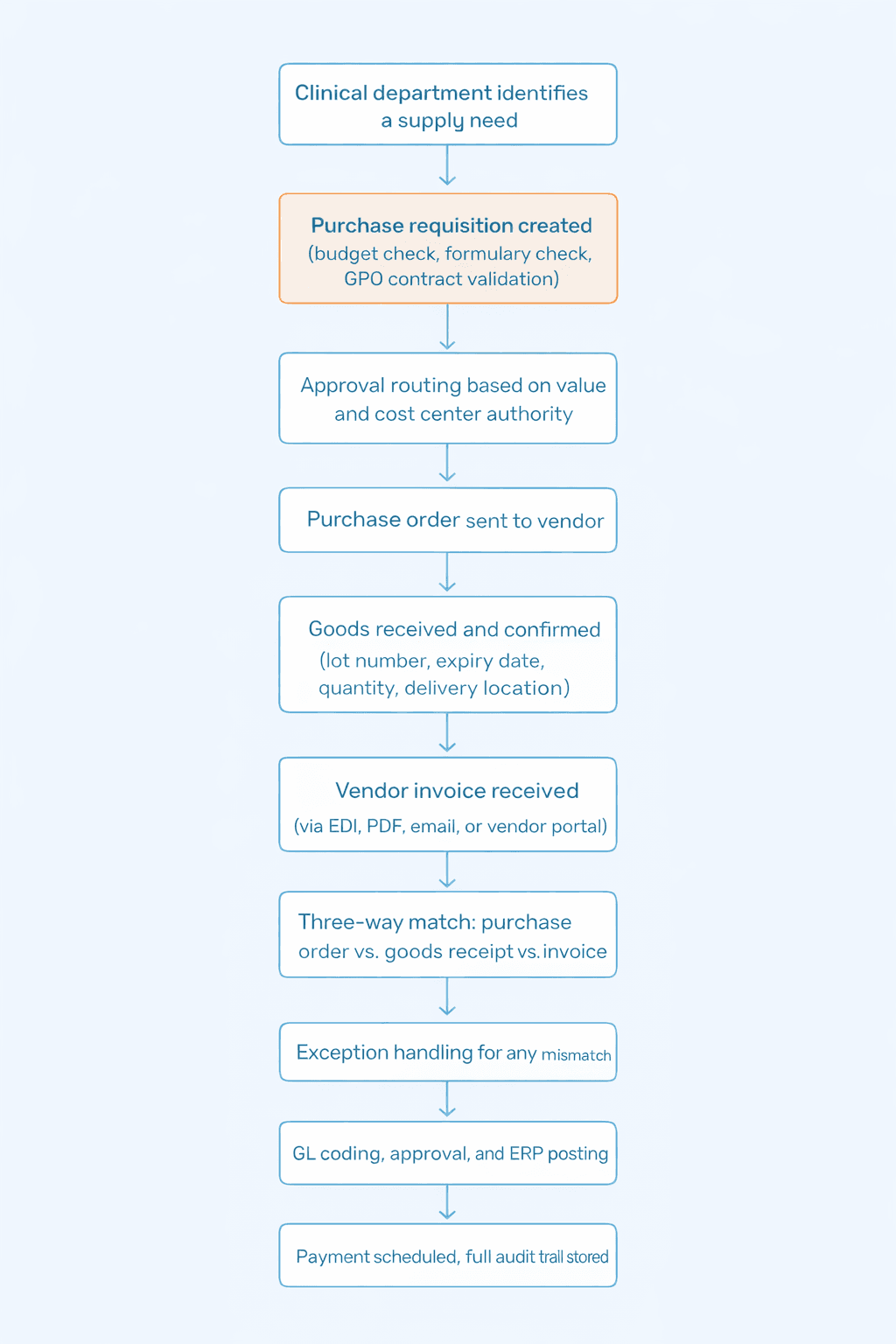 Accounts Payable. When the vendor's invoice arrives, someone verifies it matches what was ordered and received, codes it to the right cost center, gets it approved, and schedules payment. A 500-bed hospital does this thousands of times a month. Understanding the full accounts payable workflow is essential before choosing any ERP platform.