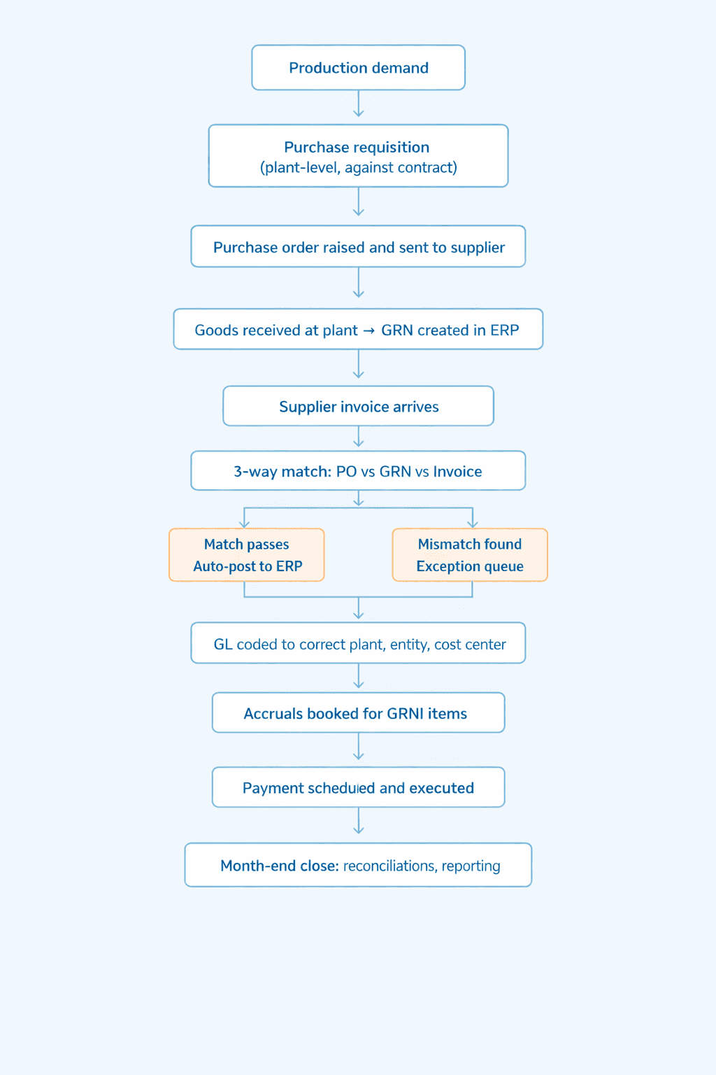 Procurement compliance breaks down at the plant level. Plant managers and procurement teams at individual facilities routinely bypass formal purchasing processes when they need materials quickly. This creates off-contract spend, duplicate purchase orders, and invoices that arrive with no corresponding PO in the ERP. Generic ERP workflows are too rigid to catch these problems at the point they happen.