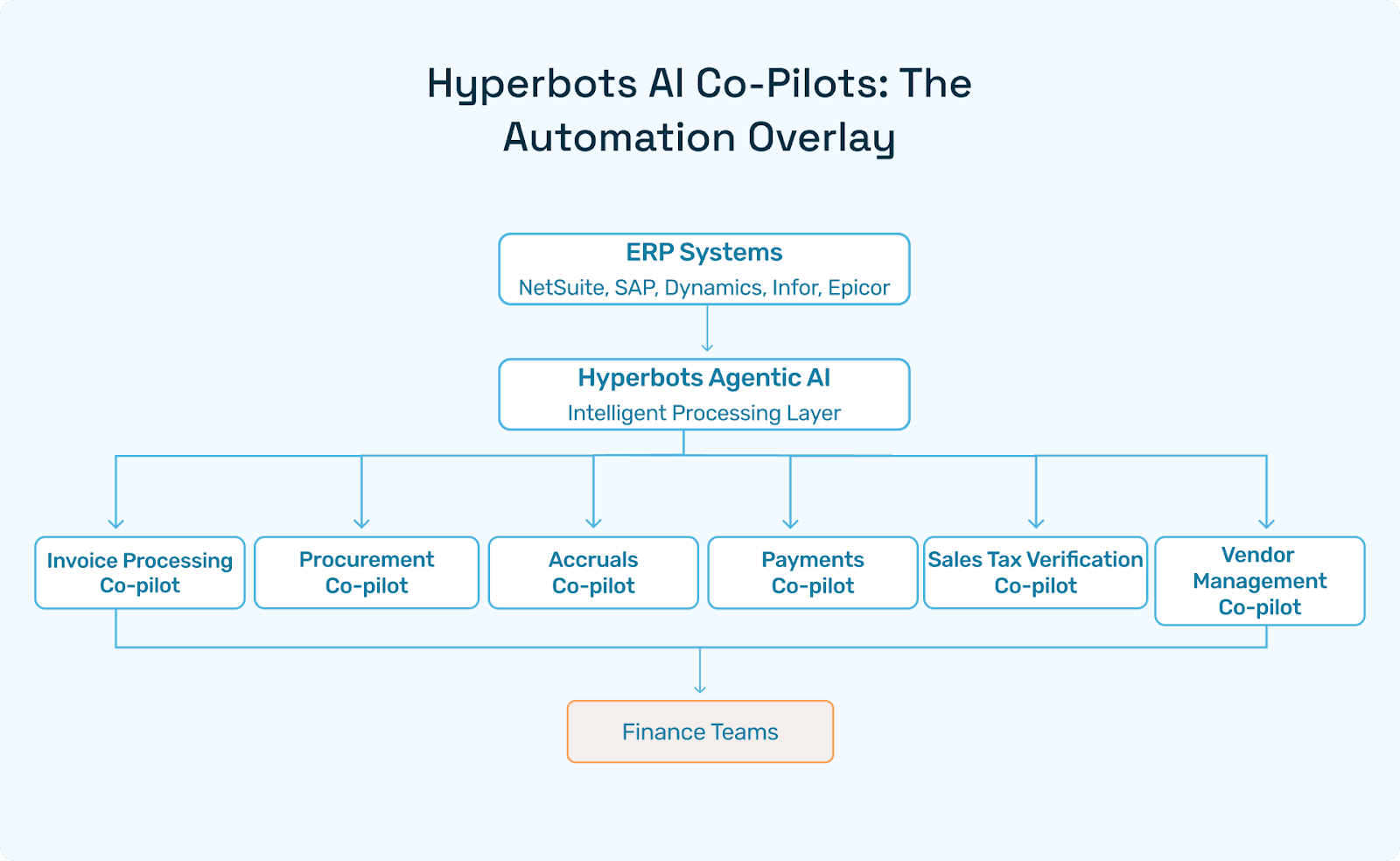 Hyperbots adds six AI Co‑pilots, such as Invoice, Procurement, Accruals, Payments, Tax Verification, Vendor Management, that layer onto any ERP, pushing invoice STP to 80% and accuracy to 99.8%.