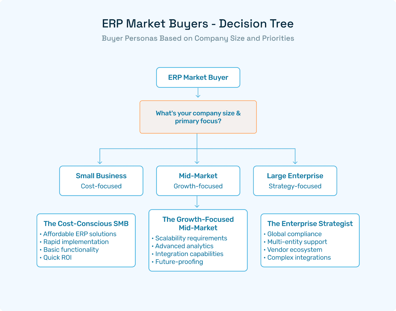 ERP market buyers range from CFOs seeking financial consolidation to CIOs prioritizing ERP integration and flexibility. We identify three buyer archetypes: