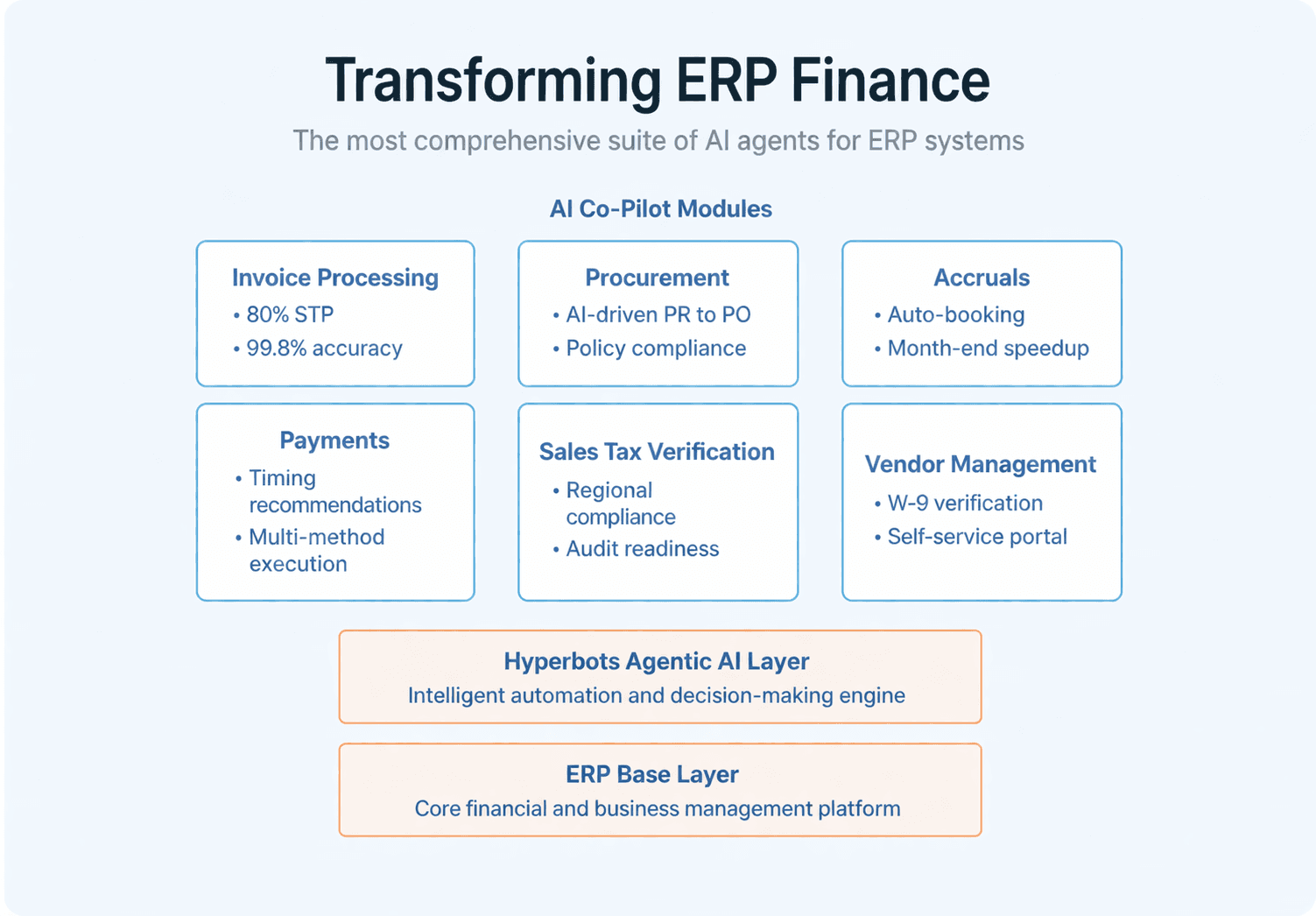 Tools like Hyperbots sit on top of existing ERPs and add the intelligence layer the system was never designed to have. Invoice processing that hits 80% straight-through with 99.8% accuracy. Procurement workflows that enforce policy at the point of purchase, not after the fact. Accruals that auto-book and reverse without someone manually working through entries at month-end. The ERP becomes the data backbone; the AI layer is what actually acts on that data.