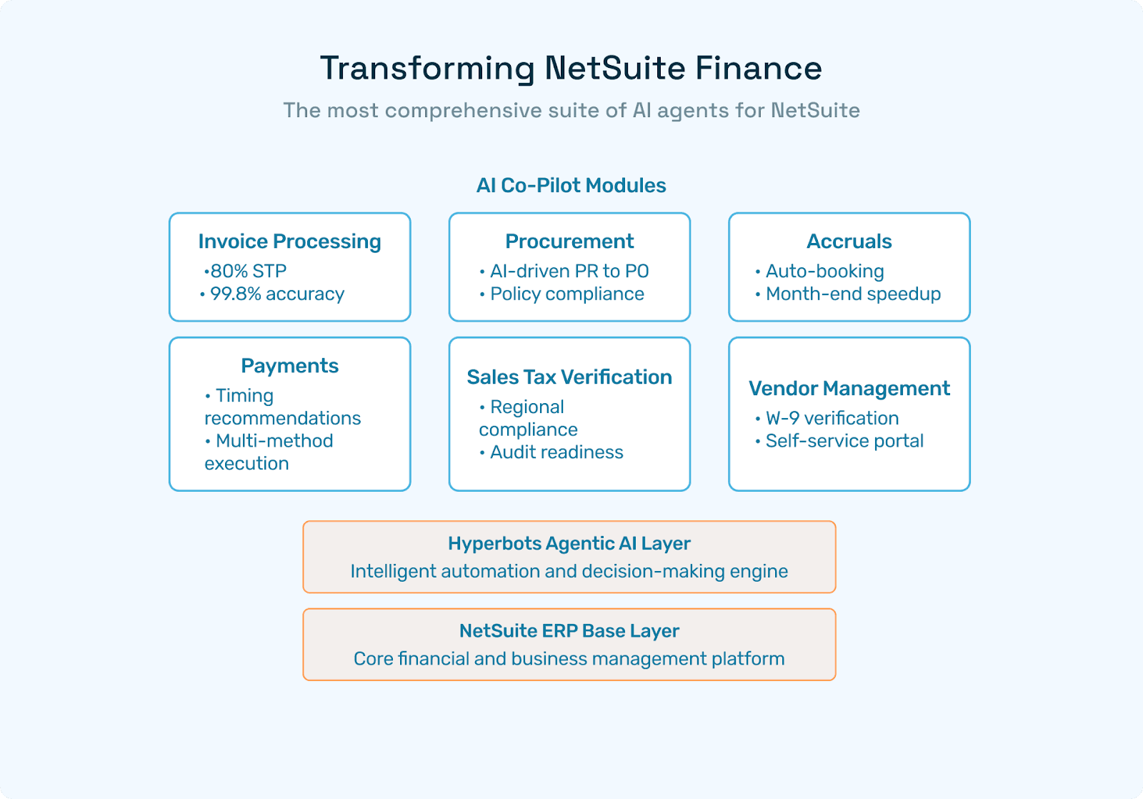 Hyperbots offers the most comprehensive suite of AI agents for NetSuite.