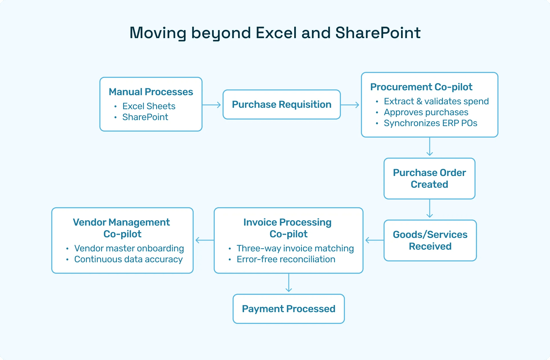 These AI Co-pilots reduce manual workload by 80%, speed PO cycles by 70%, and nearly eliminate errors, surpassing Excel or SharePoint capabilities.