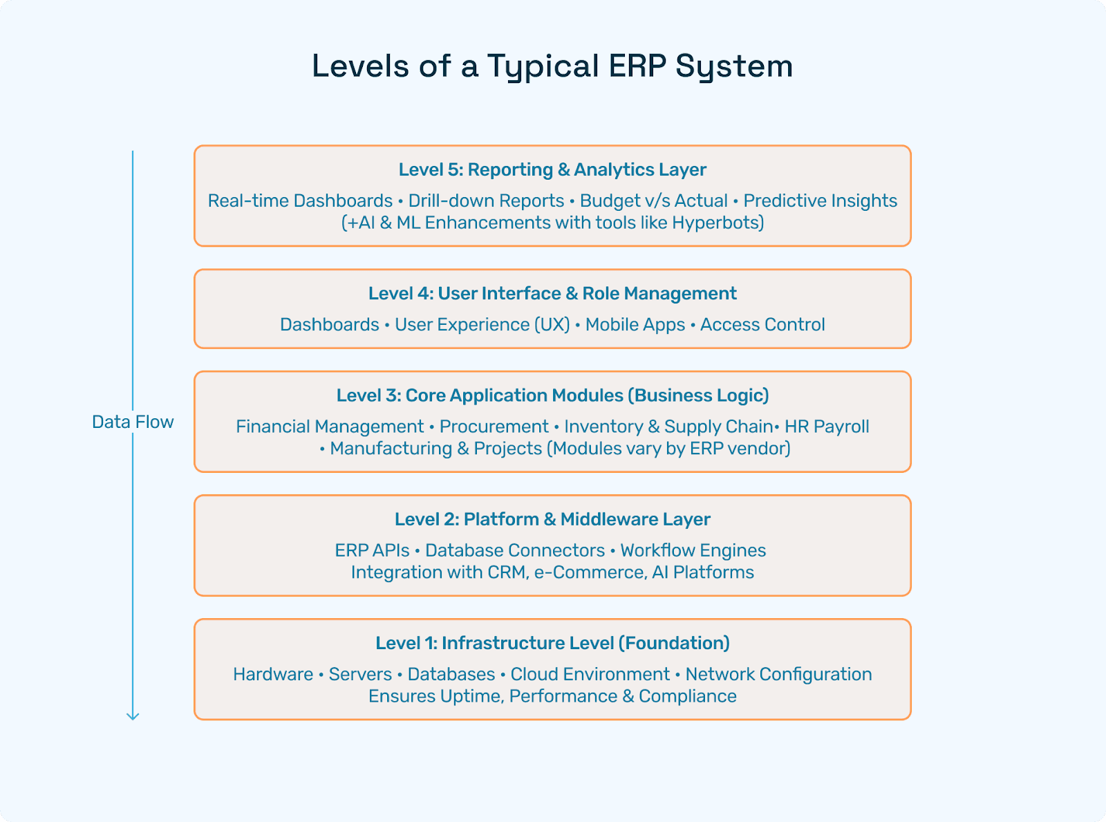 Most ERP systems include five to six levels: infrastructure, platform/middleware, core modules, UI layer, reporting, and optional AI layer.
