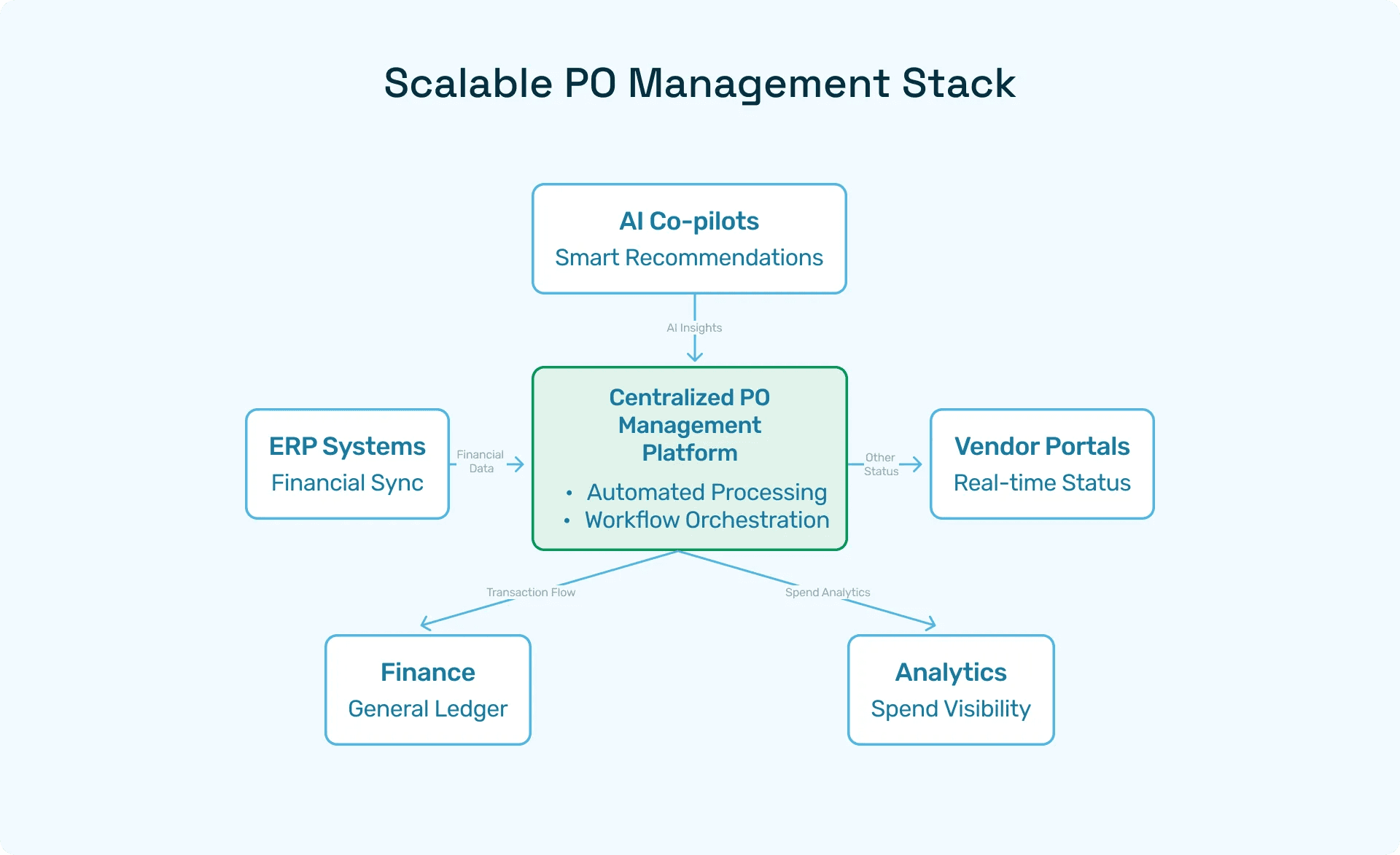 For procurement to scale effectively, integration across systems is essential. A connected PO stack ensures that financial, operational, and supplier data flows seamlessly across platforms, providing transparency and control. Key integration points include:
