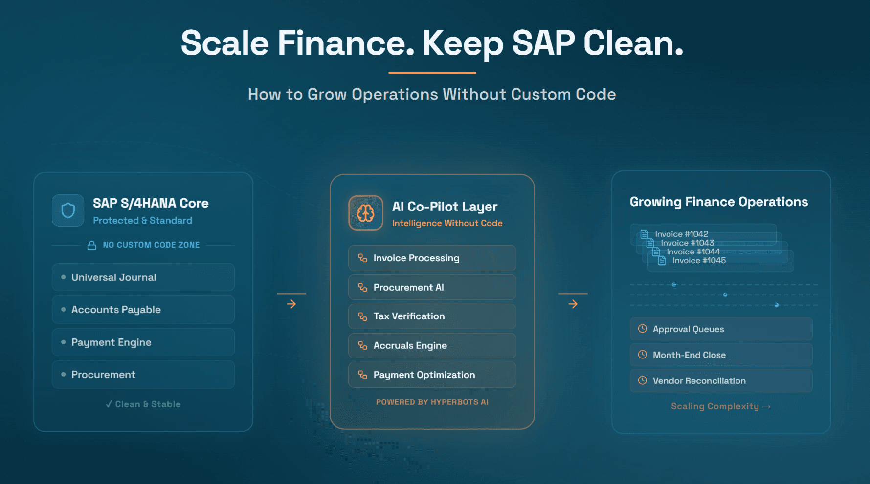 The emergence of AI-native finance automation platforms that connect to SAP through standard interfaces, rather than embedding complexity into the core, represents a structural shift in the economics of clean core maintenance. The choice is no longer between operational capability and clean core compliance. Modern AI co-pilot platforms like Hyperbots deliver the operational capability, 80% cost reduction, 99.8% accuracy, 80% straight-through processing, without the SAP core modifications that previous-generation tools required.