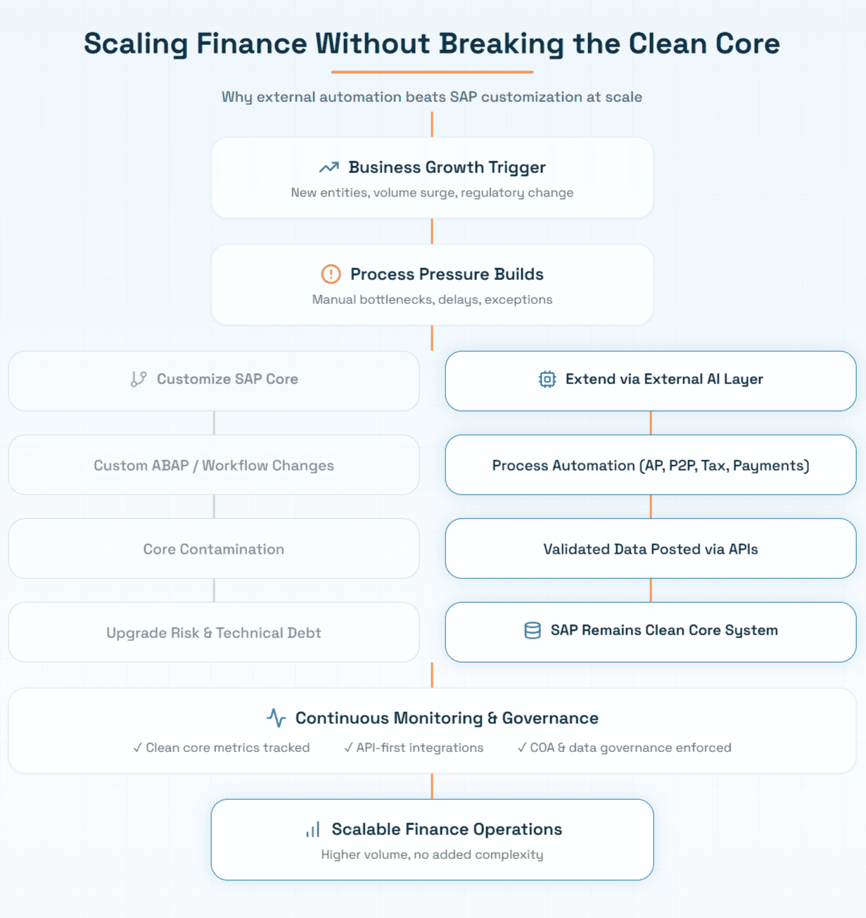 Keeping SAP S/4HANA clean while scaling finance operations requires treating clean core as an operating discipline rather than a project deliverable. The pressures that drive core contamination, volume growth, organisational expansion, regulatory change, short-term operational urgency, are permanent features of a scaling enterprise. The governance structures, architectural choices, and technology layers that resist those pressures need to be equally permanent.