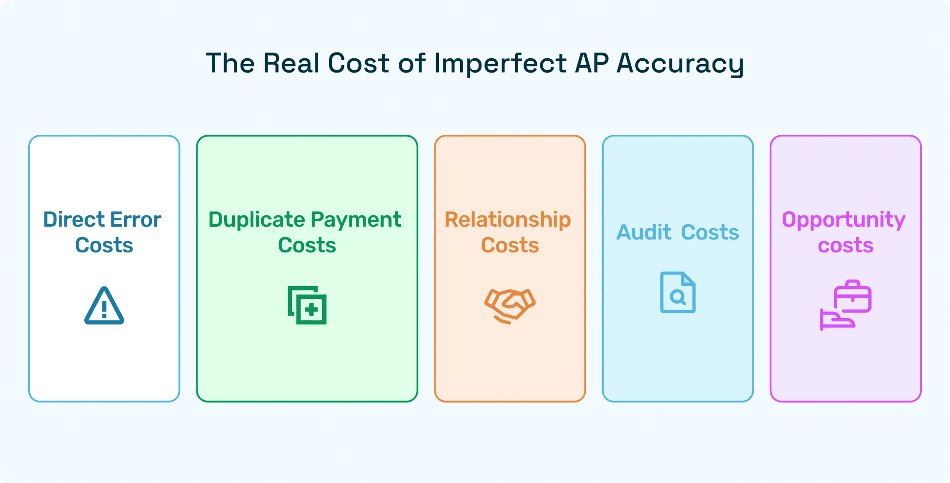 Duplicate payment costs: Automation that's 90% accurate at catching duplicates sounds pretty good until you realize that 10% of your invoice volume represents tens or hundreds of thousands of dollars paid twice. Getting that money back is painful and sometimes impossible.