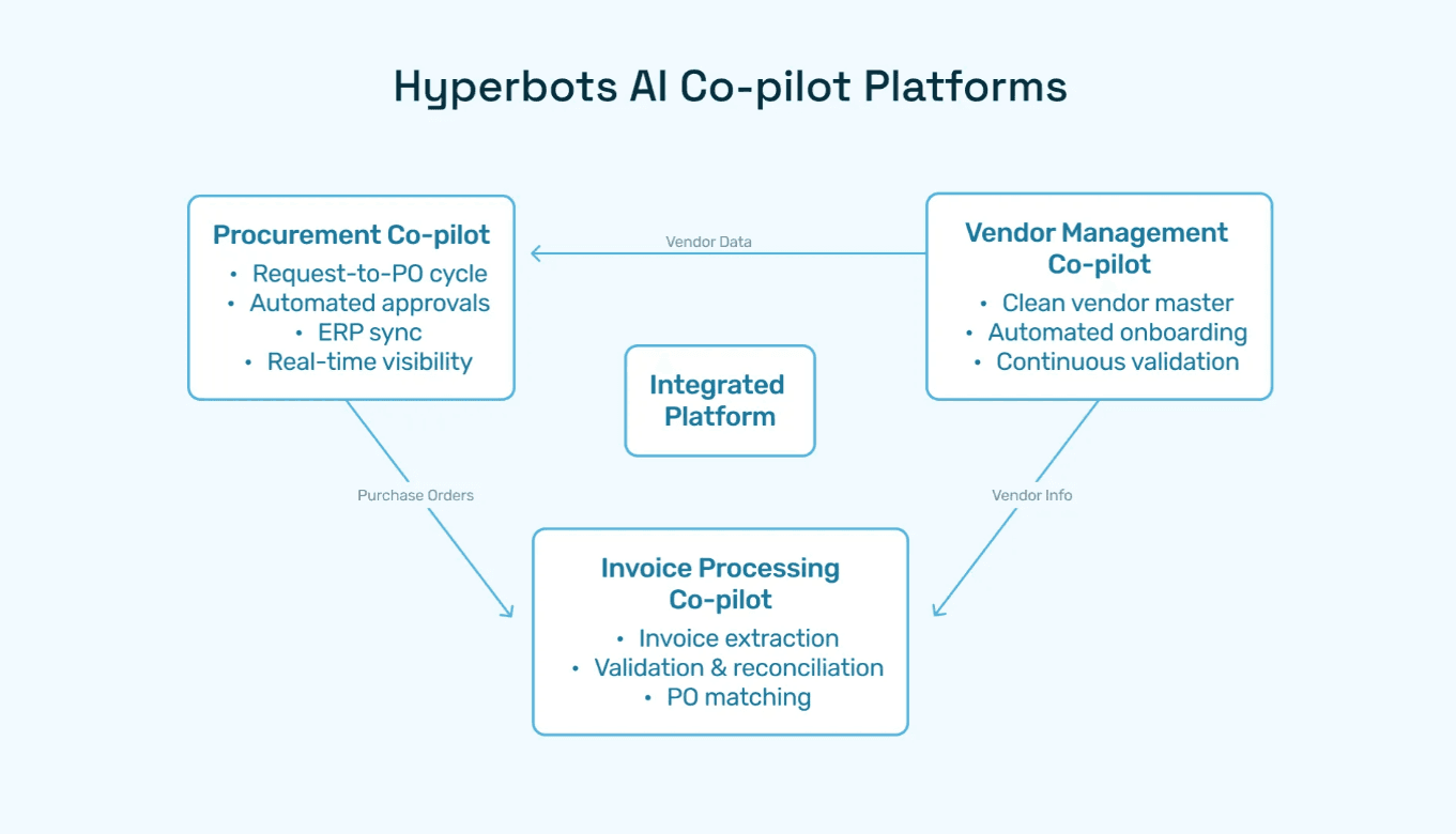 Primary Solution: Procurement Co-Pilot The Hyperbots Procurement Co-pilot revolutionizes purchase order processing by shrinking cycle times from request to purchase order completion. This intelligent automation solution:
