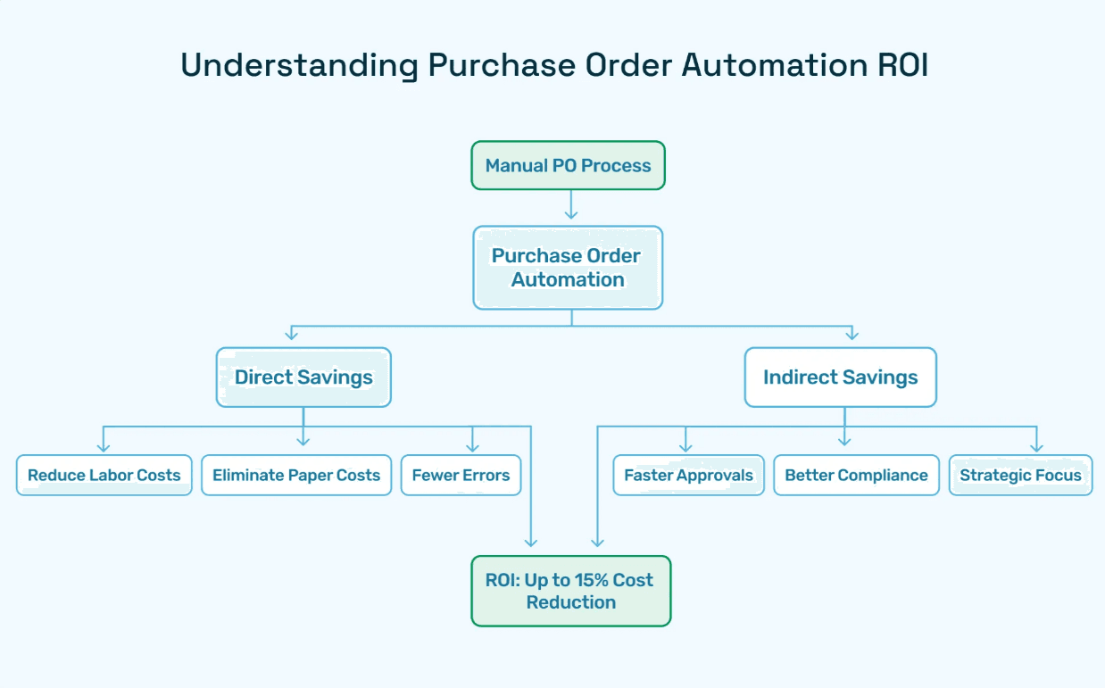 Purchase order automation ROI encompasses both direct cost savings and indirect efficiency gains achieved through systematic digitization of procurement workflows. The calculation includes: