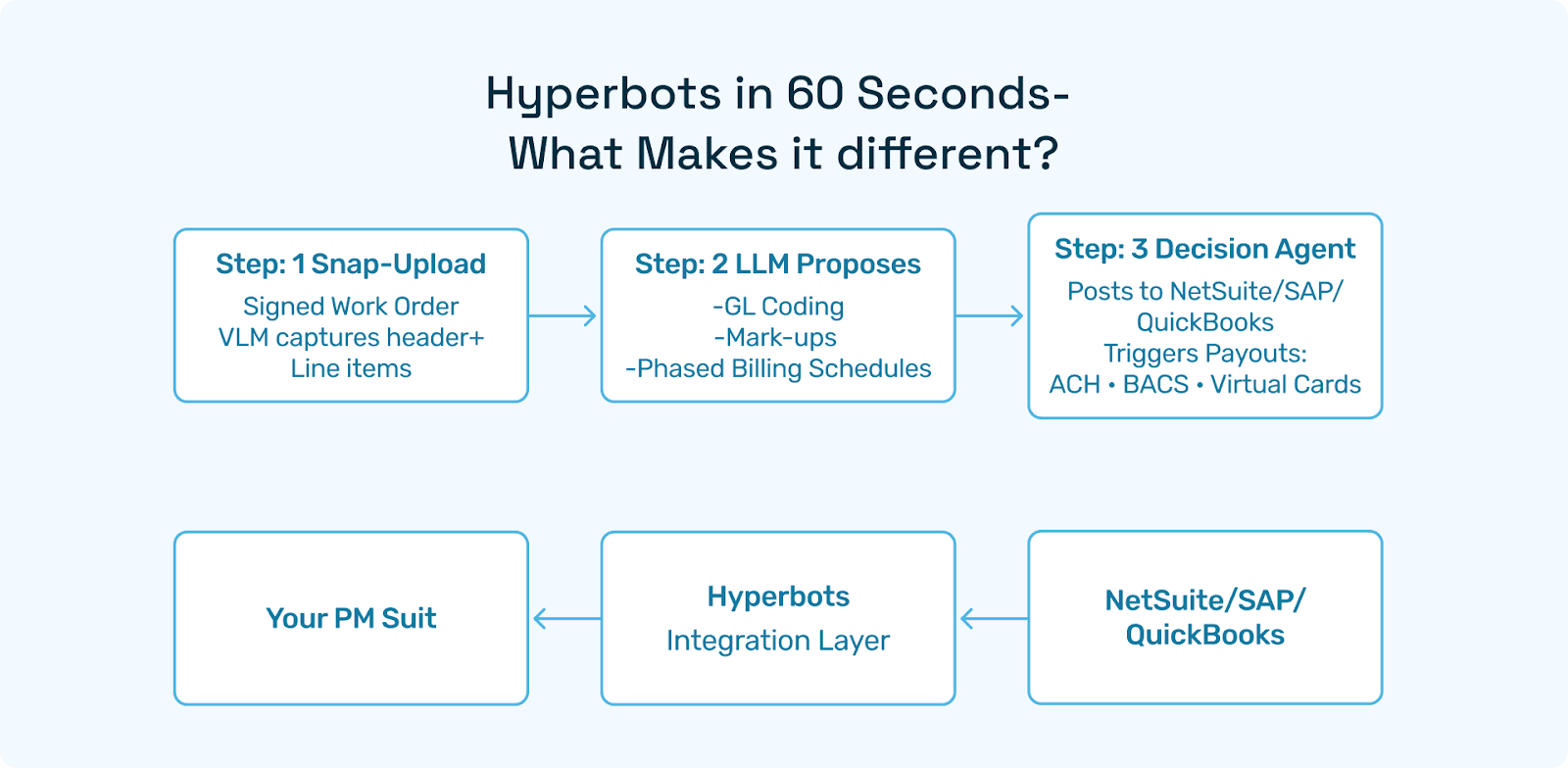 Agentic Project Management and Billing software, powered by Vision-Language Models (VLMs) and Large Language Models (LLMs), now turns every completed task into an invoice line, routes approvals in chat, reconciles payments automatically, and even pays your subcontractors’ bills. Hyperbots’ Invoice Processing Co-Pilot sits at the centre of this revolution, stitching together project data, invoices, and Accounts Payable with 99.8% field accuracy.