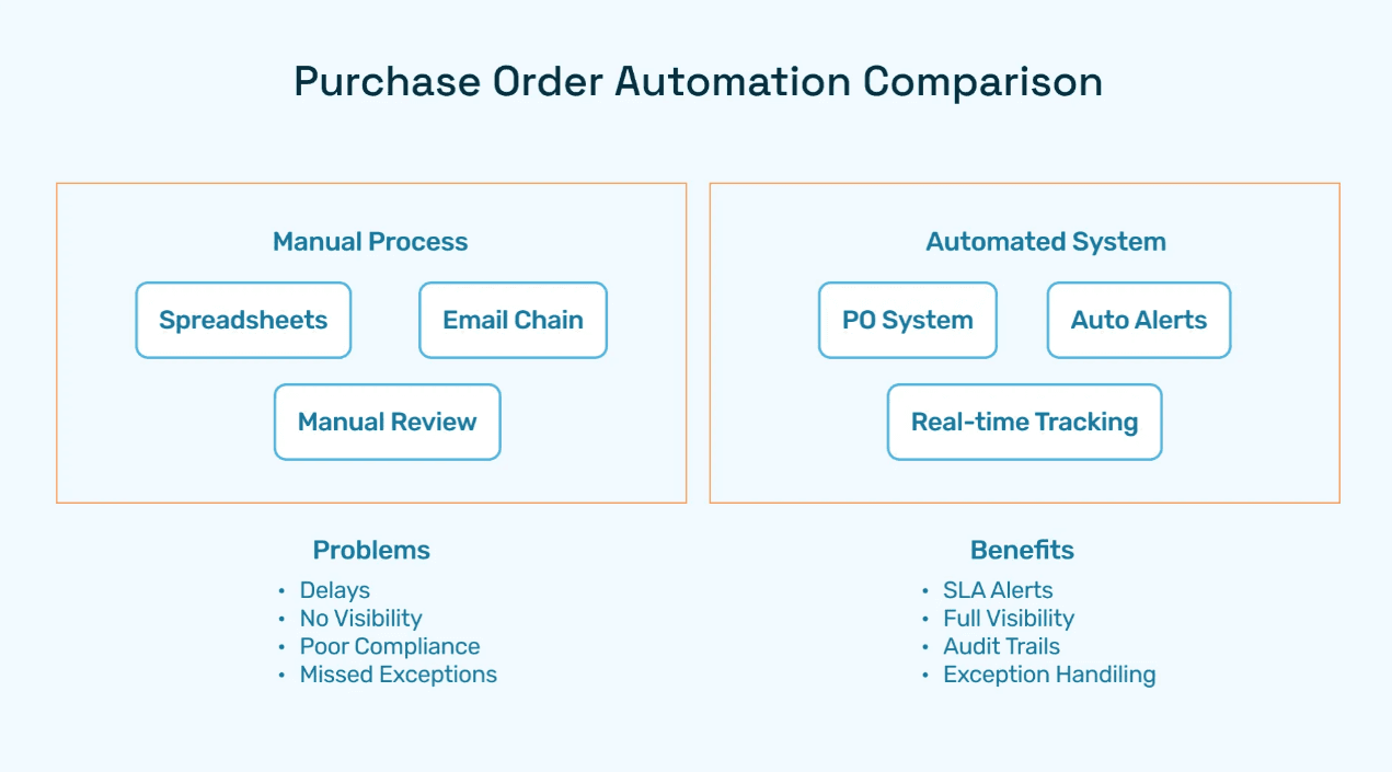 Limitation: Most PO systems operate as rigid, rules-based frameworks. They reduce paper usage but don’t fundamentally solve inefficiency, errors, or fraud.