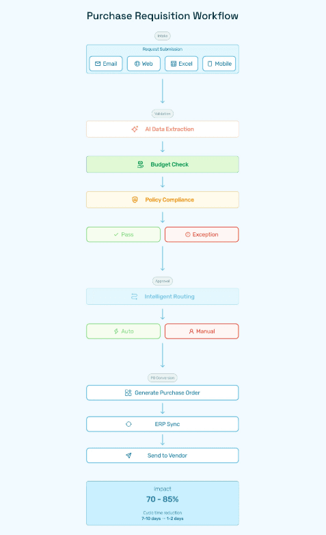 Cycle Time Reduction: 70-85% represents the most immediate impact. Requisitions that previously required 7-10 days from submission to purchase order completion now process in 1-2 days for routine purchases and 2-4 days for complex items requiring specialized review. This acceleration stems from eliminating approval delays, automating data validation, processing multiple steps concurrently, and reducing exception handling time.