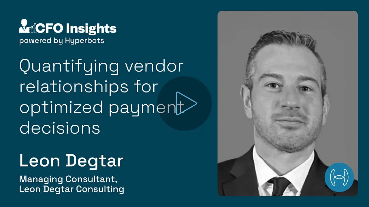 Sherry: Hello, and welcome to all our viewers on CFO Insights. I am Sherry, a financial technology consultant at Hyperbots, and I'm very excited to have Leon Degtar here with me, who is an experienced operations and finance leader with a track record of driving growth, optimizing processes, and leading successful exits and mergers. Thank you so much for being here with us, Leon. Today we'll be talking about quantifying vendor relationships and criticality for optimized payment decisions. To get us started, Leon, how do you define vendor relationship criticality? Why is it important to make payment timing decisions?
