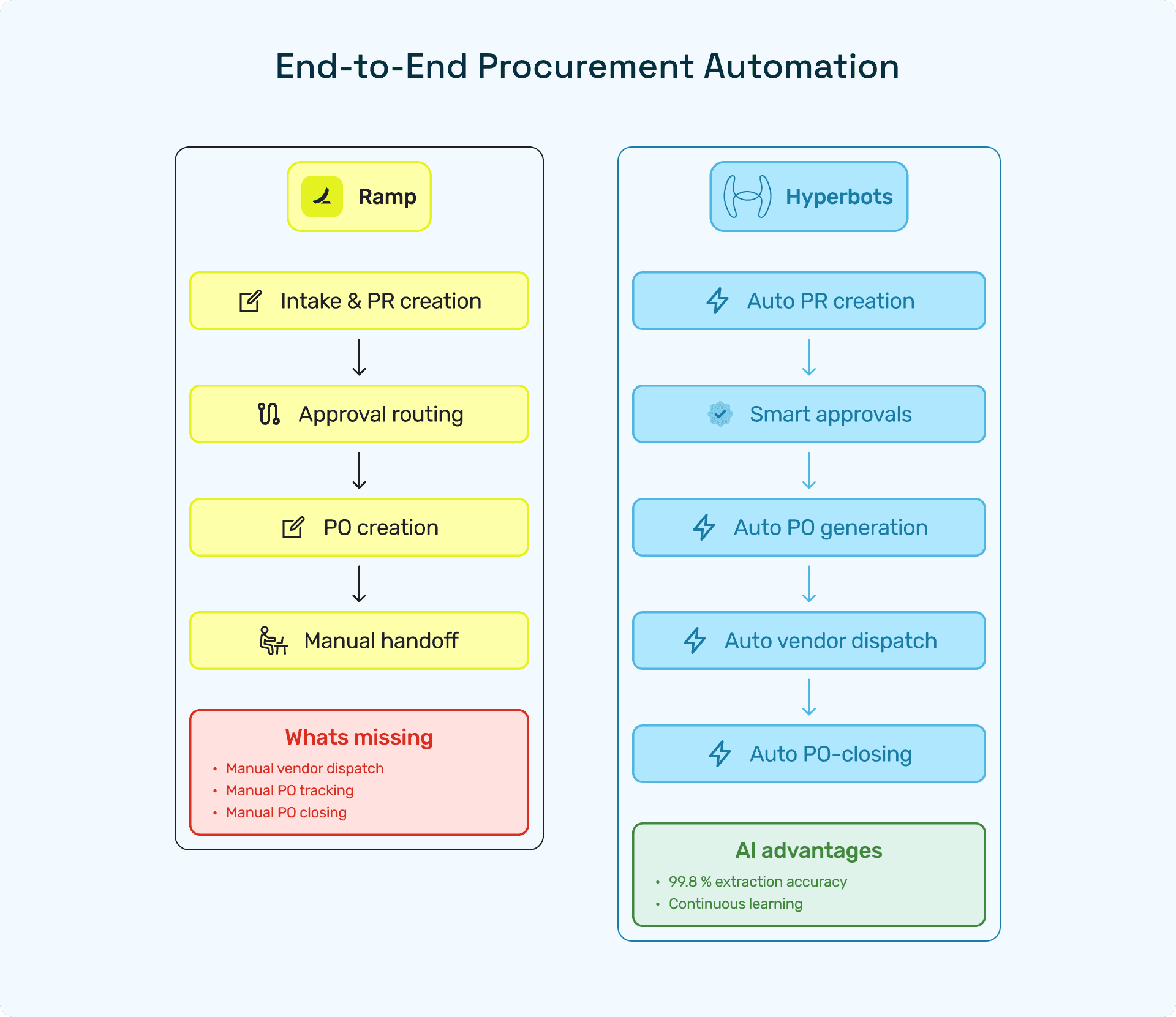 While Ramp automates intake, approvals, and PO creation, Hyperbots extends automation across the full procurement lifecycle. It generates POs, dispatches them to vendors, manages collaboration, and automates PO closing, connected directly to invoice processing. This eliminates handoffs, accelerates cycle time, and ensures tighter process continuity from requisition through reconciliation, creating a fully unified procurement environment.