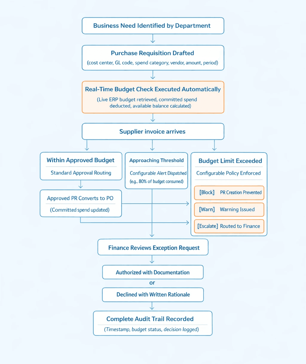 Budget control in procurement operates across three dimensions. The first is visibility: does the organization know its true available budget at any point in time? The second is enforcement: does the system prevent or escalate purchases that would breach the budget? The third is accountability: is there a complete, auditable record of every budget check, alert, and approval decision?