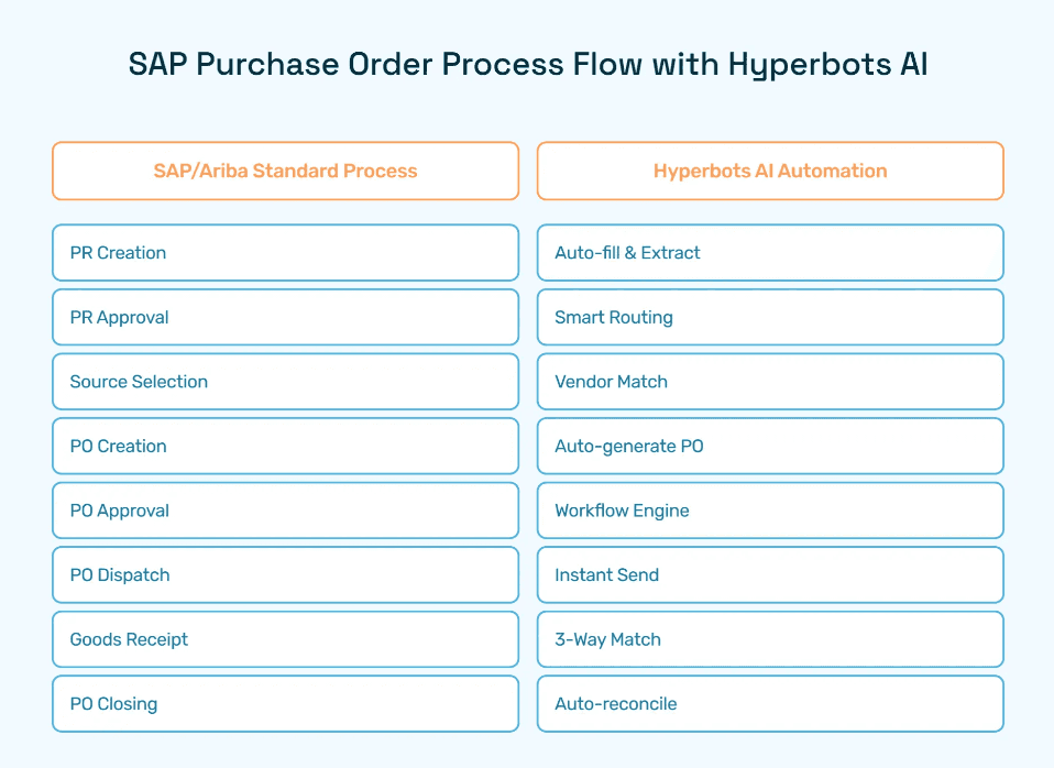 This is where Hyperbots stands apart. As the leading AI-first platform for Finance and Accounting automation, Hyperbots enhances SAP and Ariba workflows by embedding AI Co-pilots directly into every stage of the purchase order lifecycle. Instead of relying on fragmented manual steps, enterprises gain an intelligent layer of automation that ensures accuracy, compliance, and speed at scale.