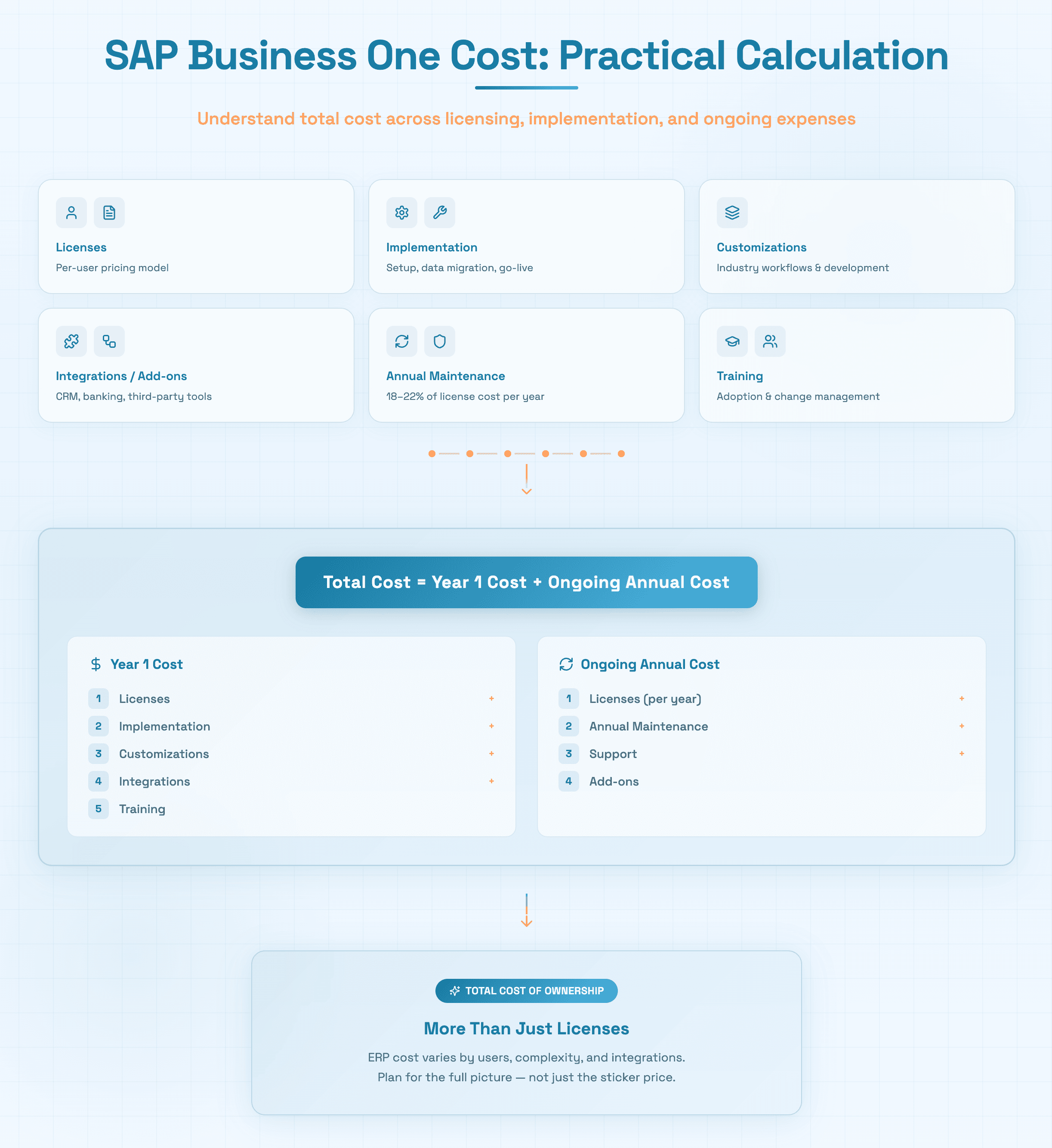 A: Beyond licensing and implementation, hidden SAP Business One costs include customization and custom development, third-party add-ons and modules, system integration expenses, annual maintenance fees (18–22% of license cost), upgrade costs, user training, and change management.