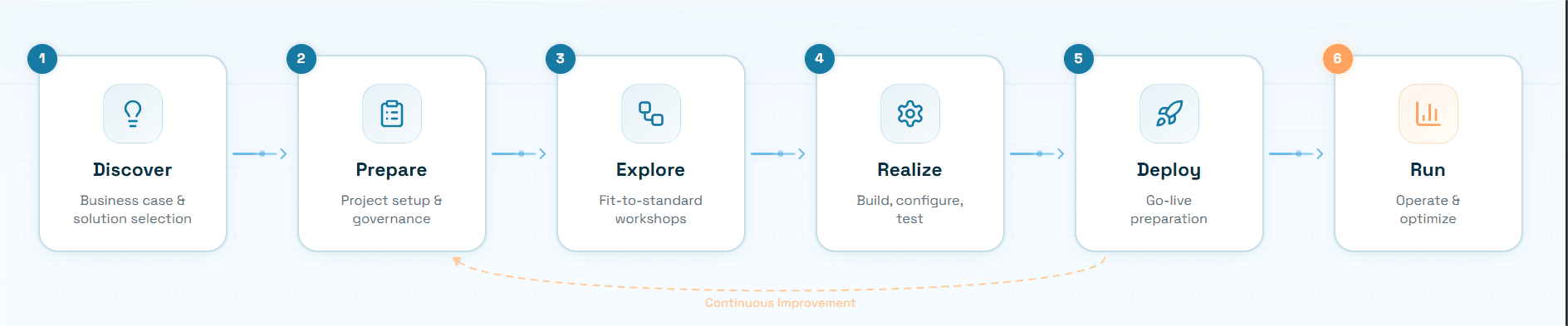 The SAP Activate methodology includes six phases: Discover, Prepare, Explore, Realize, Deploy, and Run. Each phase has defined deliverables, quality gates, and accelerators. Understanding what each phase requires, and where projects typically go wrong within it, is the core of effective SAP implementation project management.