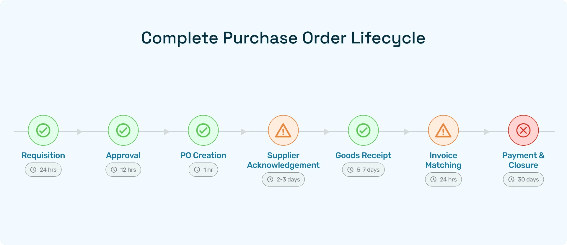Understanding how a purchase order works requires following the complete lifecycle from initial need identification through final payment. This end-to-end process typically consists of seven key stages:
