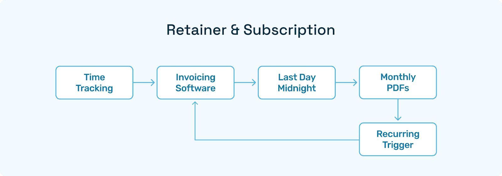 Recurring time tracking invoicing software triggers monthly PDFs at midnight on the last day.