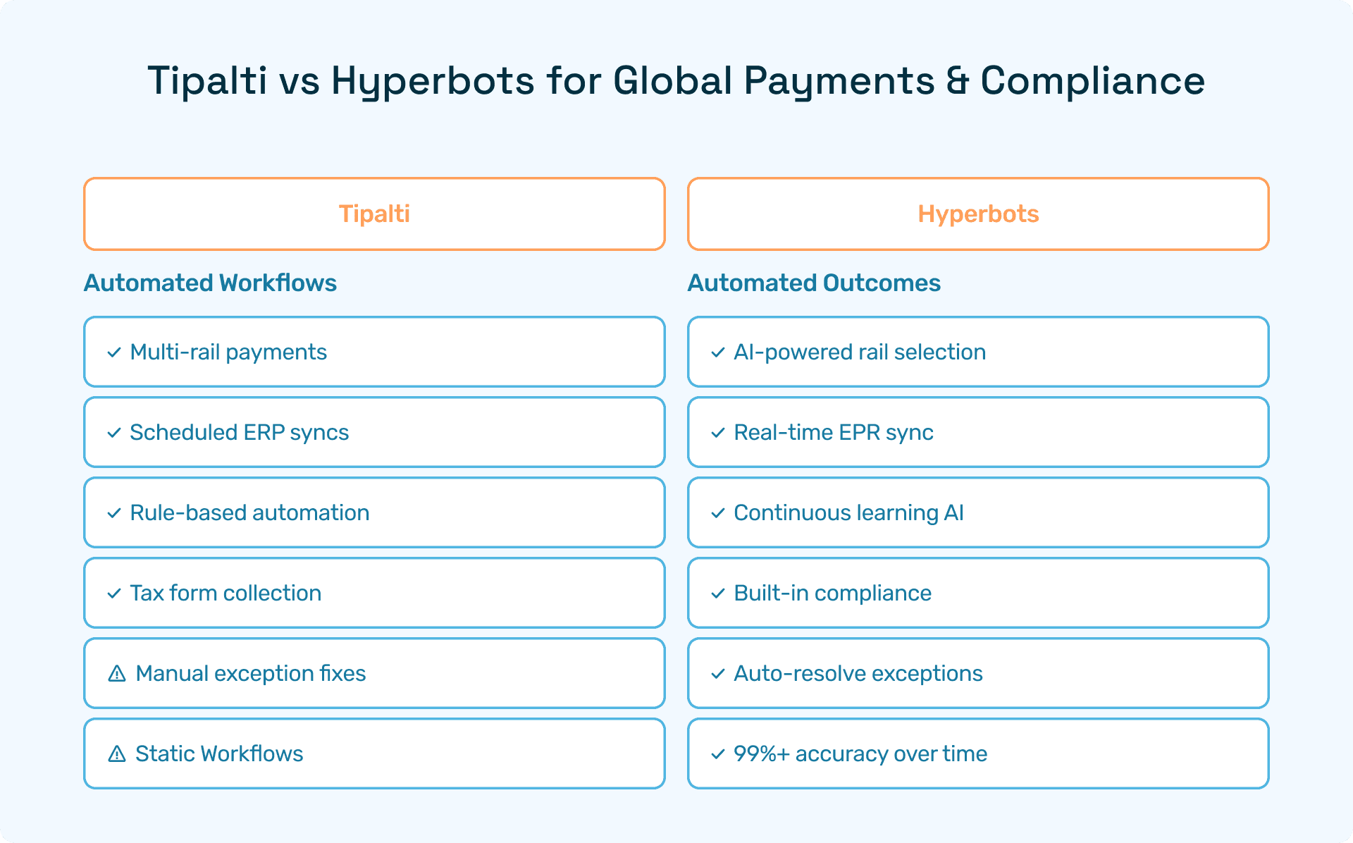 Tipalti automates workflows. But Hyperbots automates outcomes.