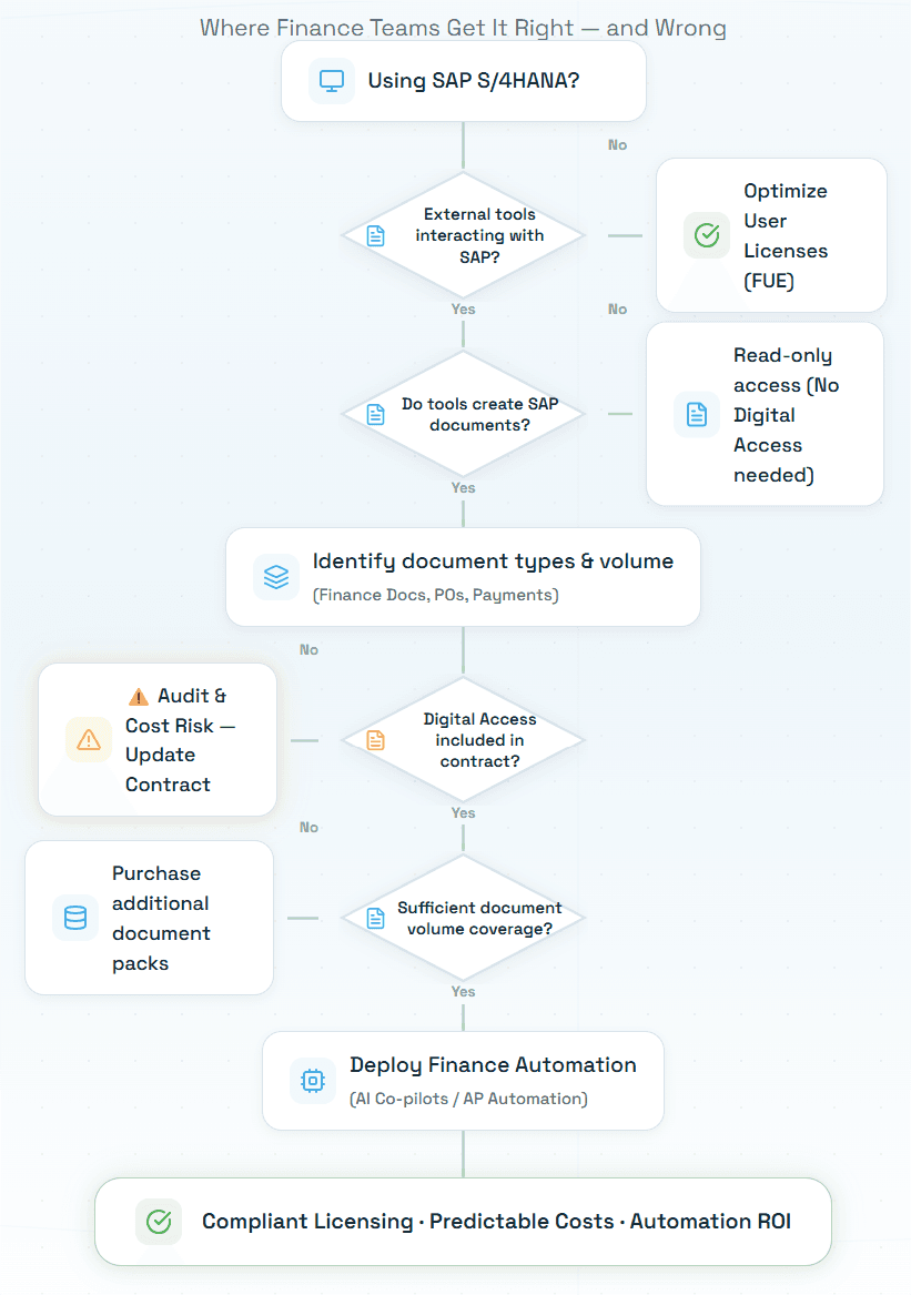 Finance's specific exposure: Every time an AP automation tool posts a vendor invoice to SAP FI-AP, a Finance Document, that is a Digital Access-triggering event if the tool is classified as a third-party non-SAP system. A finance function processing 5,000 invoices per month generates 60,000 Finance Document creation events per year. Without Digital Access licensing explicitly covering this volume, the organization has a material compliance exposure that an SAP audit will surface.