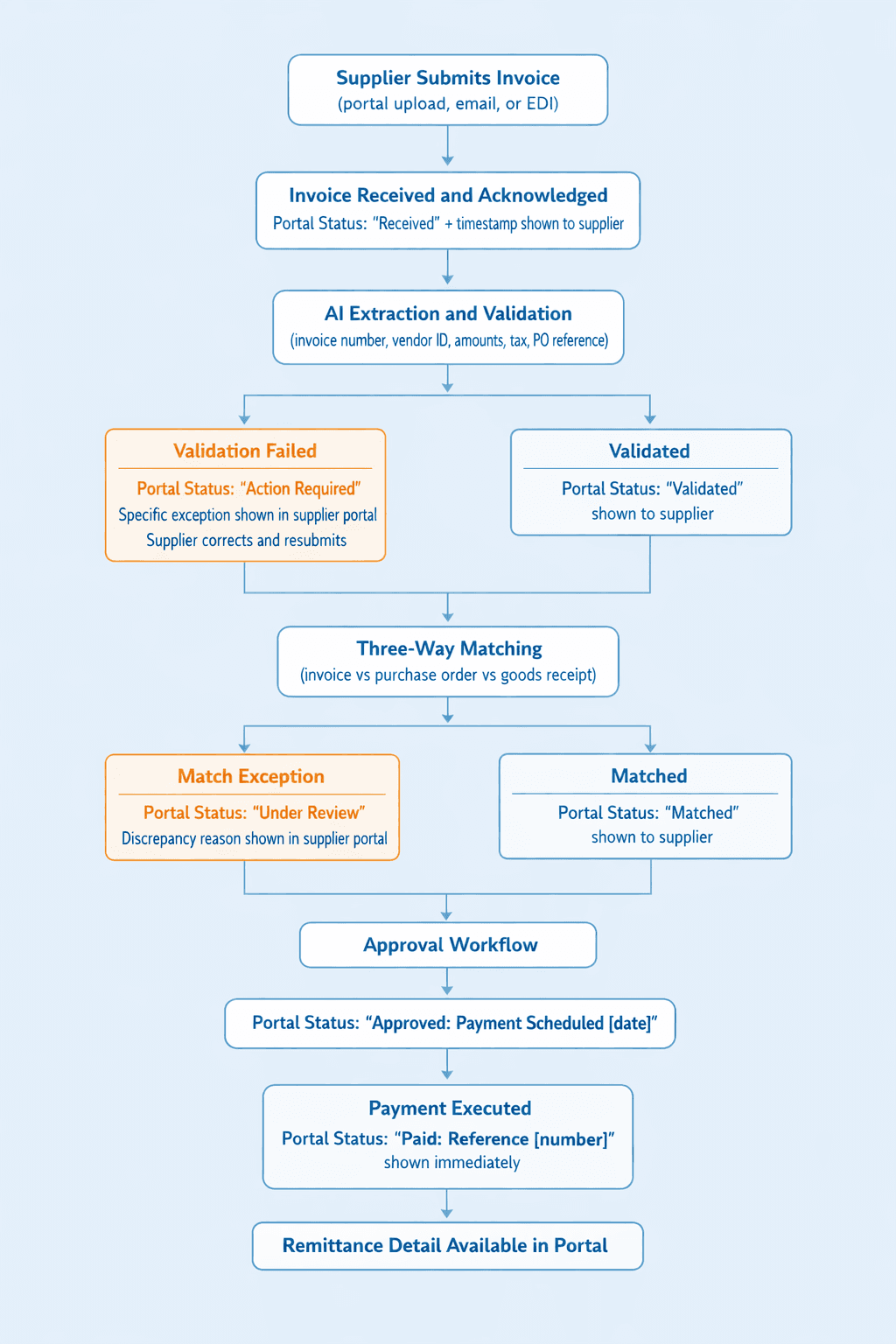The vendor portal is not a separate system bolted on to AP operations. It is the external-facing layer of the same processing workflow the AP team uses internally. Understanding how it connects to each stage of supplier invoice processing explains why real-time integration is the defining requirement.