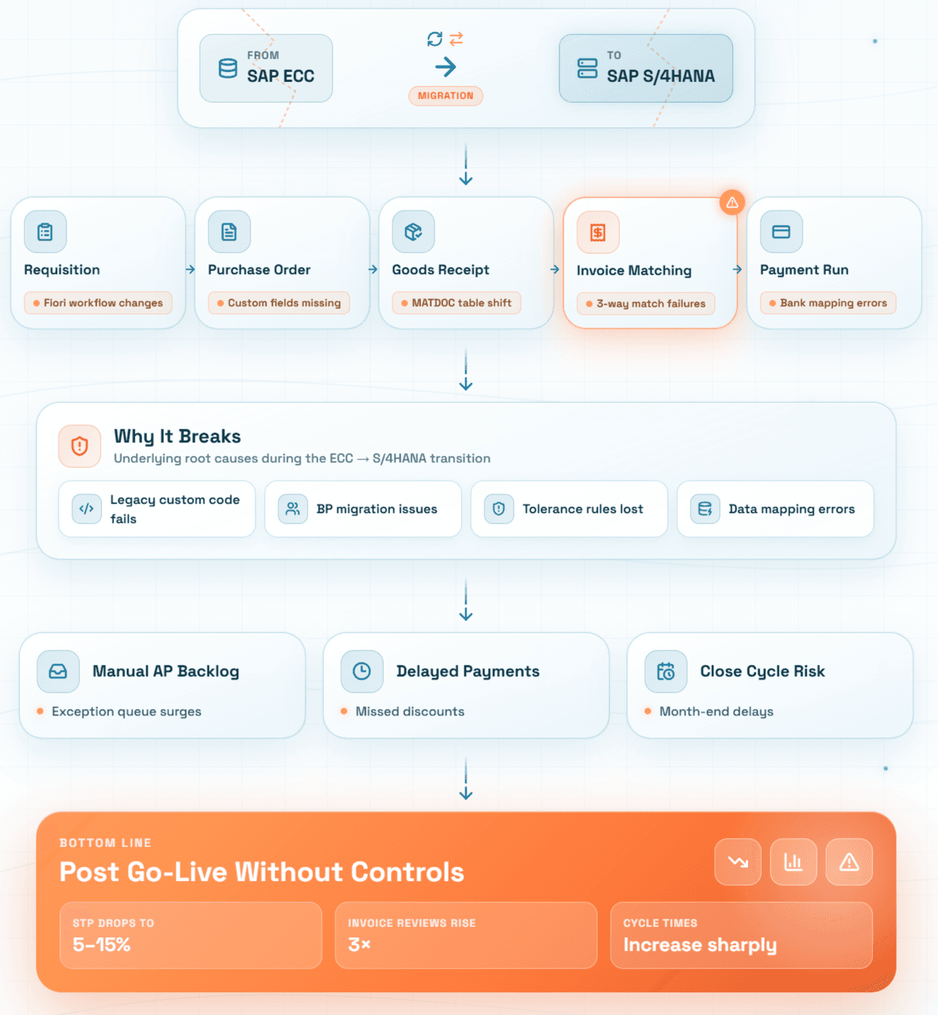 Why this matters for STP: Straight-through processing rates, the percentage of invoices that clear without human intervention, typically drop from 30–50% in mature ECC setups to single digits immediately after an S/4HANA go-live, because all the tolerance and routing rules that enabled automation have been disrupted. Recovery can take 12–18 months without deliberate remediation. See also: constraints on straight-through processing of invoices.