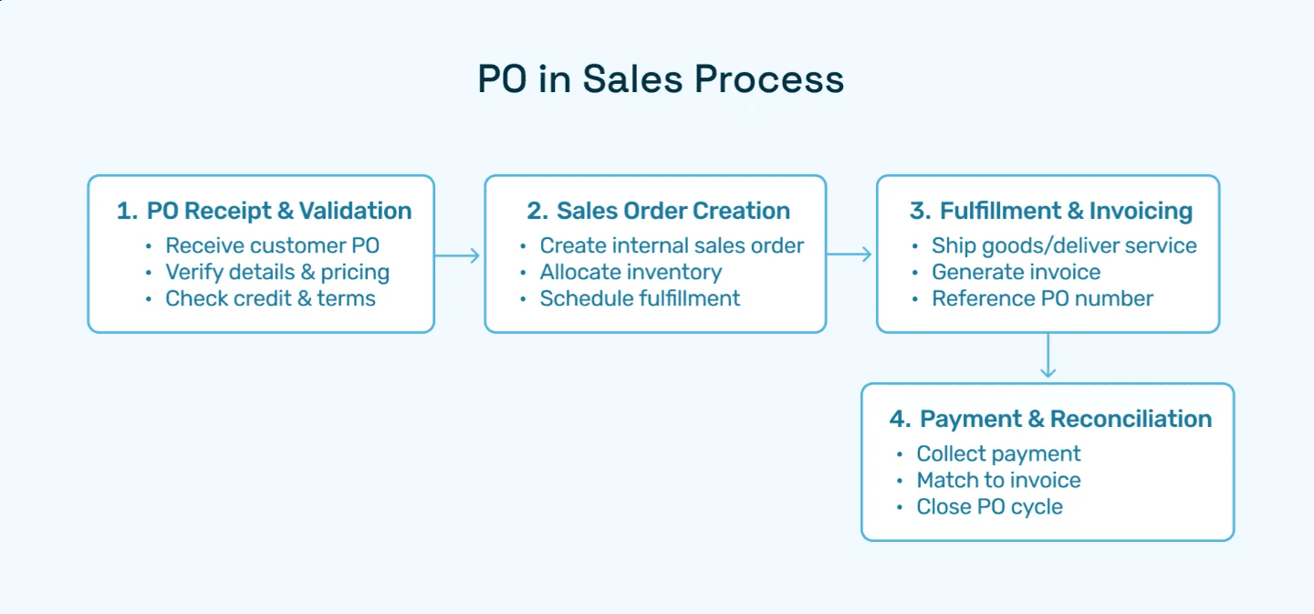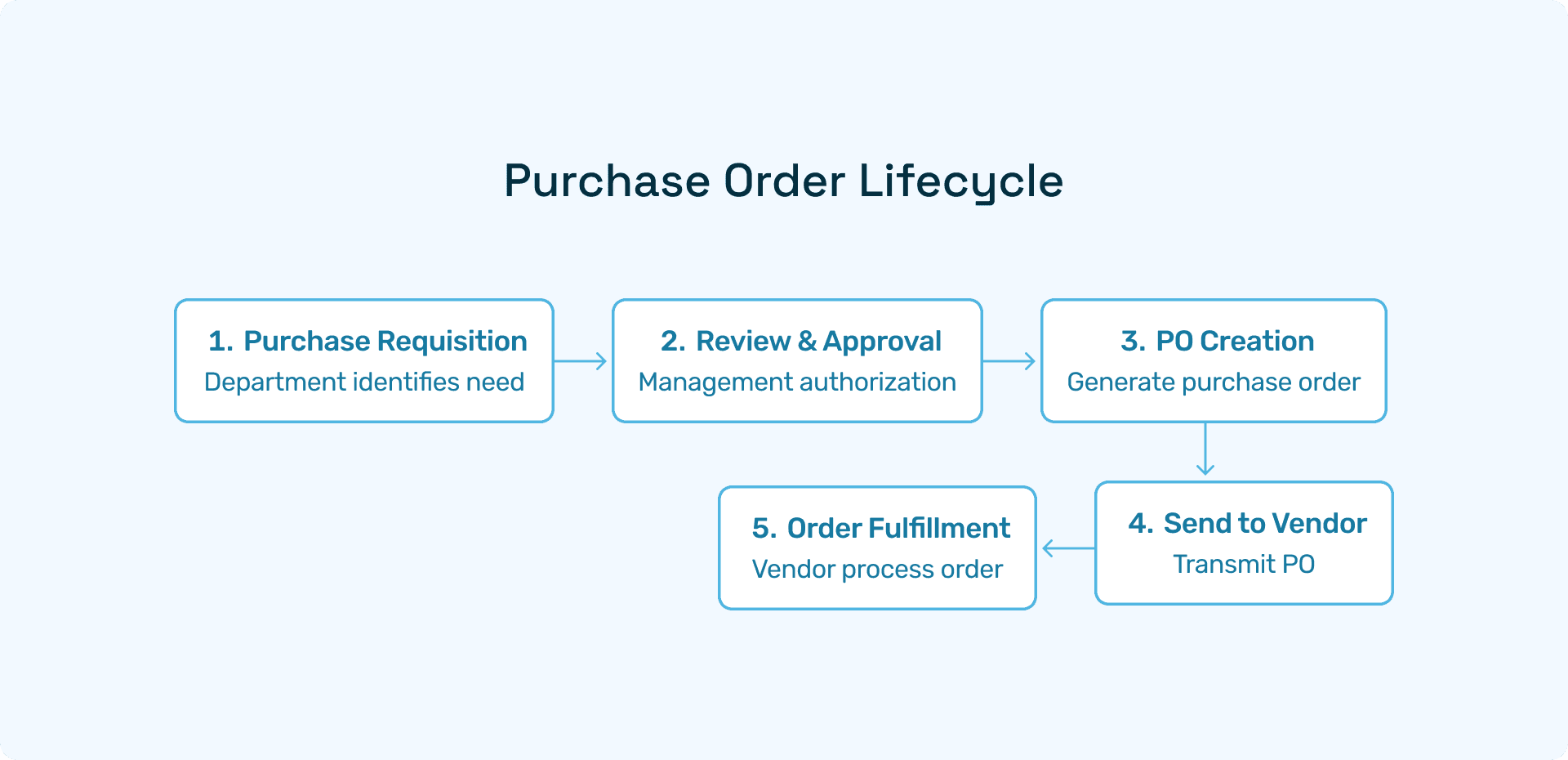 The vendor receives the PO, acknowledges acceptance, and fulfils the order according to specified terms. Communication during this phase is crucial for managing expectations and addressing any issues.