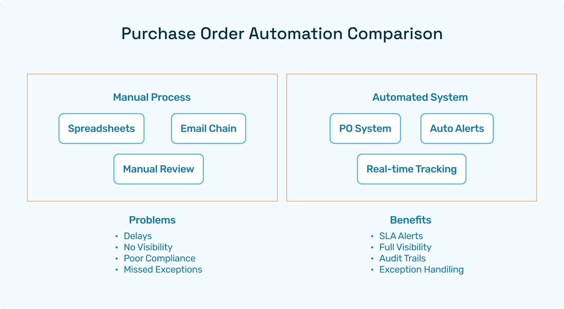Regulated industries and government contractors, in particular, cannot afford weak documentation. Manual PO processes frequently result in incomplete records, missing approval logs, or inconsistently stored data. These gaps expose organizations to compliance risks, failed audits, and potential penalties.