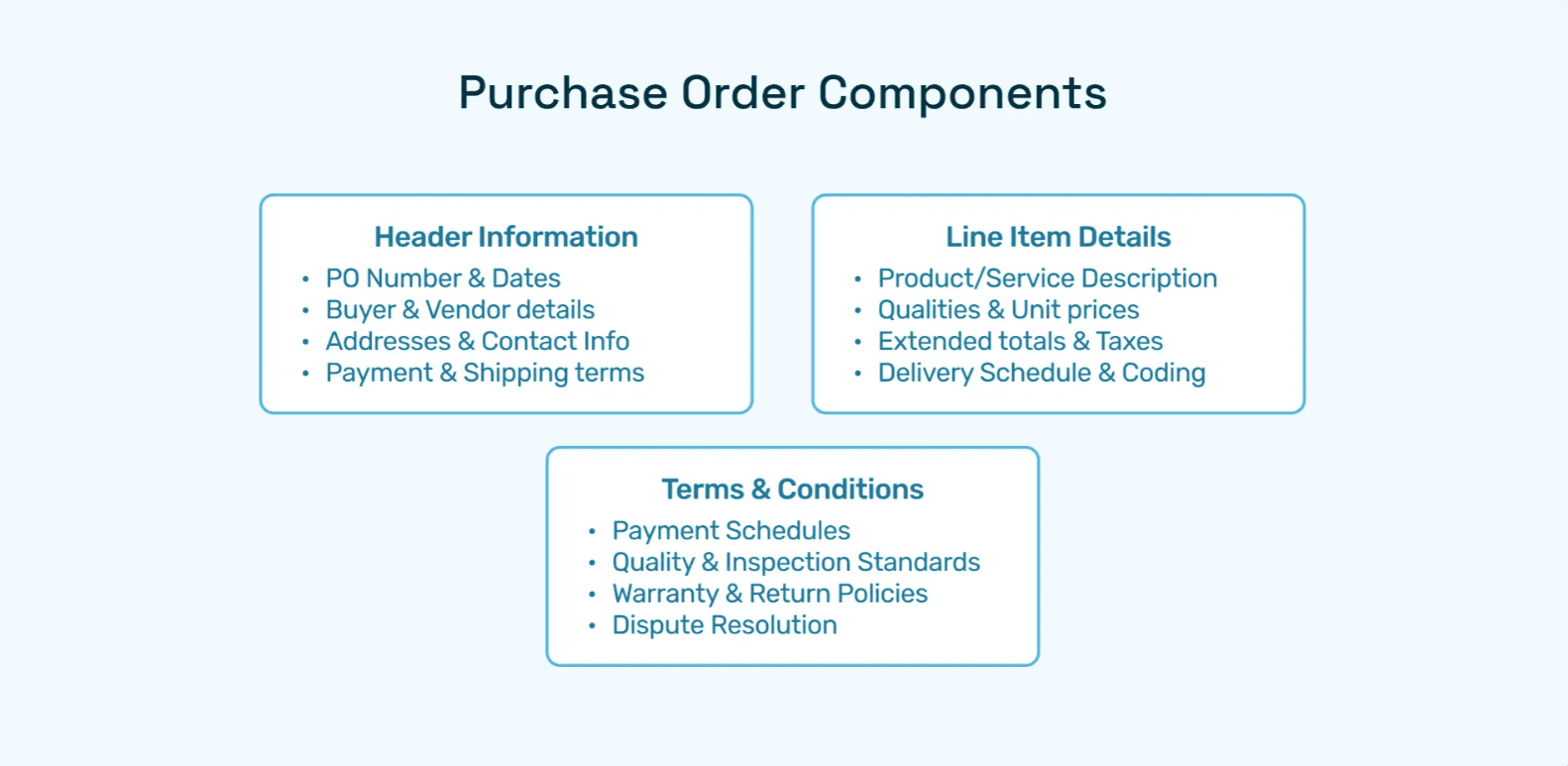 Structured Data Fields: Every standard purchase order contains mandatory fields such as PO number, vendor information, line items with descriptions and quantities, delivery dates, payment terms, and authorized approver signatures. This consistency enables automated processing and reduces manual intervention requirements.