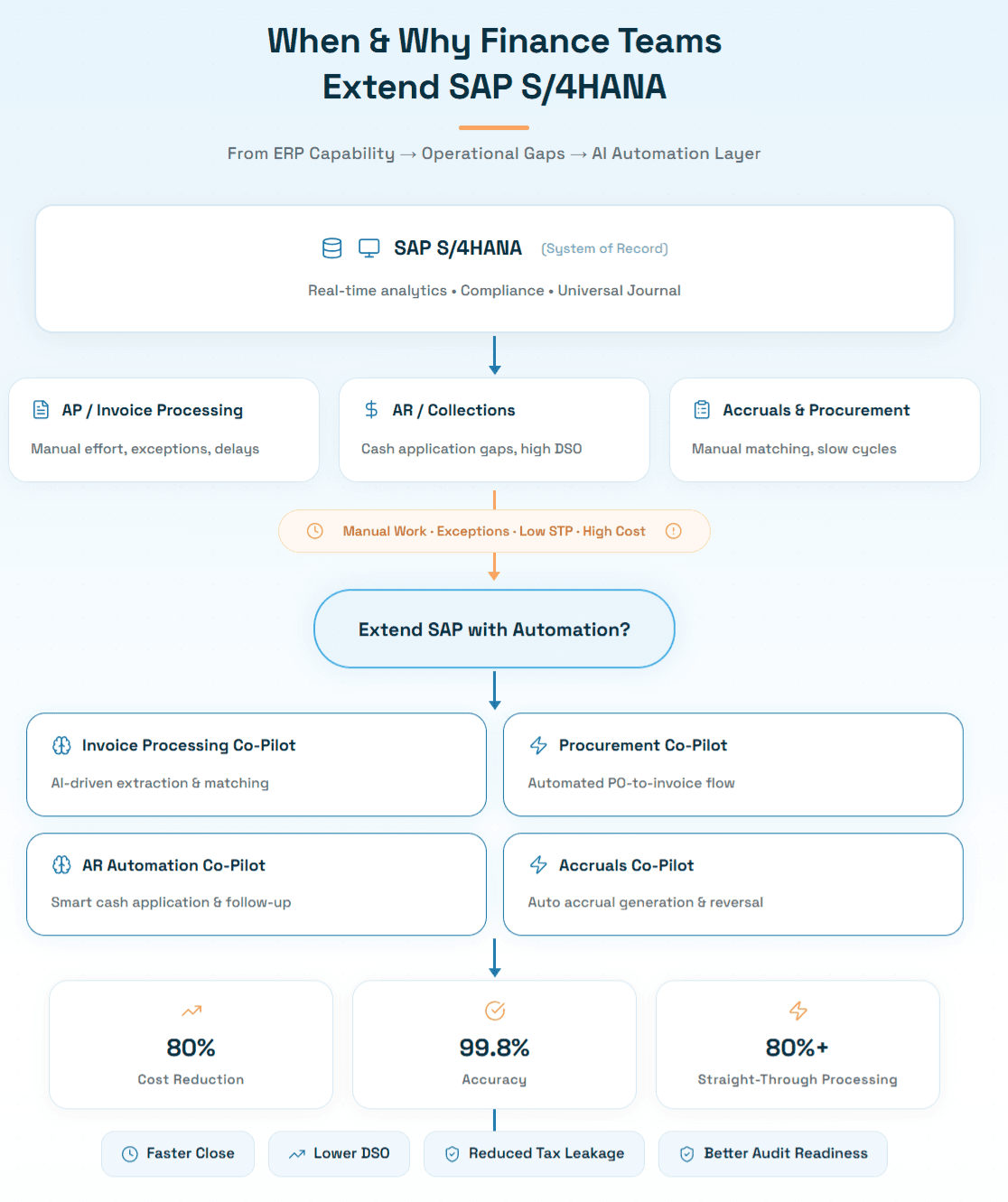 The finance teams achieving the most significant operational improvements today are those that have made a deliberate architectural choice: use SAP for what it does best (financial record-keeping, reporting, compliance, and integration) and extend it with purpose-built AI finance platforms that deliver autonomous processing, intelligent exception handling, and continuous learning across AP automation, AR automation, procurement, accruals, and payments.