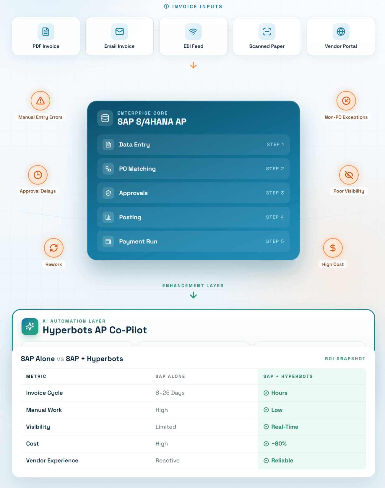 The solution isn't complex. It's adding Hyperbots to handle the workflow, visibility, and exception management that SAP S/4HANA wasn't designed to do on its own. Explore the ROI framework for AI-led automation in finance.