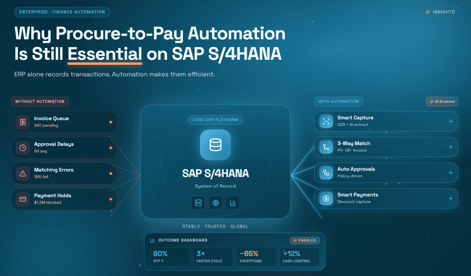 The honest answer is that SAP S/4HANA was built to record, structure, and manage business data, not to intelligently automate the end-to-end procure-to-pay (P2P) process. There is a meaningful difference between having an ERP and having true P2P automation. Understanding that gap is the first step to closing it.