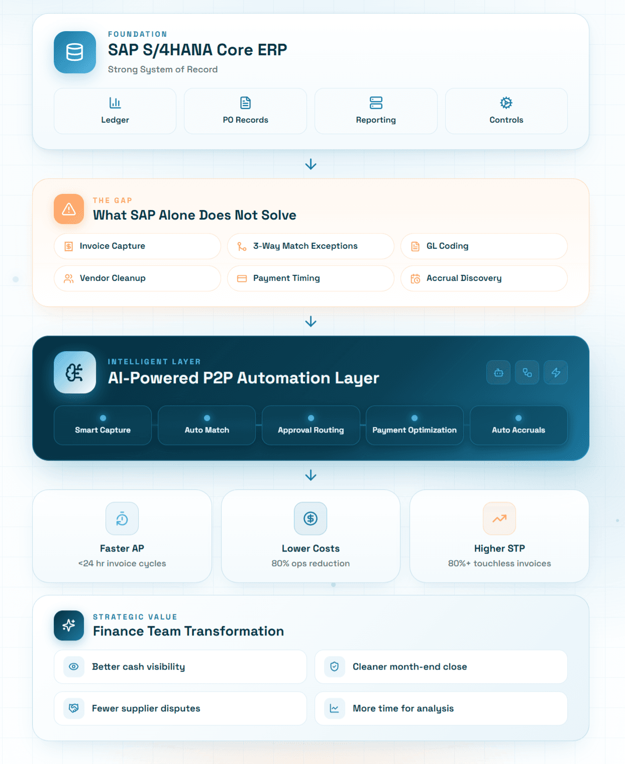 SAP S/4HANA is an extraordinary platform. But it was designed to manage structured business processes, not to intelligently automate the messy, document-heavy, judgment-intensive work that happens in every AP and procurement team every day.